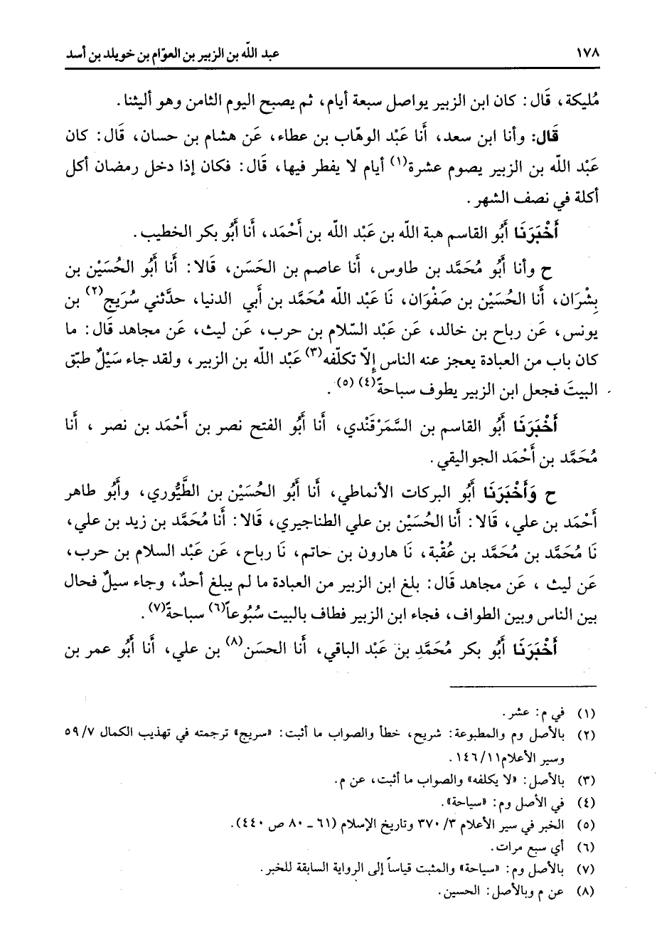 مليكة قال كان ابن الزبير يواصل سبعة ايام ثم يصبح اليوم الثامن وهو أليثنا قال وأنا ابن سعد أنا عبد الوهاب بن عطاء عن هشام بن حسان قال كان عبد الله بن الزبير يصوم عشرة (1) ايام لا يفطر فيها قال فكان إذا دخل رمضان اكل اكلة في نصف الشهر أخبرنا أبو القاسم هبة الله بن عبد الله بن أحمد أنا أبو بكر الخطيب ح وأنا أبو محمد بن طاوس أنا عاصم بن الحسن قالا أنا أبو الحسين بن بشران أنا الحسين بن صفوان نا عبد الله محمد بن أبي الدنيا حدثني سريج (2) بن يونس عن رباح بن خالد عن عبد السلام بن حرب عن ليث عن مجاهد قال ما كان باب من العبادة يعجز عنه الناس الا تكلفه (3) عبد الله بن الزبير ولقد جاء سيل طبق البيت فجعل ابن الزبير يطوف سباحة (4) (5) أخبرنا أبو القاسم بن السمرقندي أنا أبو الفتح نصر بن أحمد بن نصر أنا محمد بن أحمد الجواليقي ح وأخبرنا أبو البركات؟ والانماطي أنا أبو الحسين بن الطيوري وأبو طاهر أحمد بن علي قالا أنا الحسين بن علي الطناجيري قالا أنا محمد بن زيد بن علي نا محمد بن محمد بن عقبة نا هارون بن حاتم نا رباح عن عبد السلام بن حرب عن ليث عن مجاهد قال بلغ ابن الزبير من العبادة ما لم يبلغ احد وجاء سيل فحال بين الناس وبين الطواف فجاء ابن الزبير فطاف بالبيت سبوعا (6) سباحة (7) أخبرنا أبو بكر محمد بن عبد الباقي أنا الحسن (8) بن علي أنا أبو عمر بن