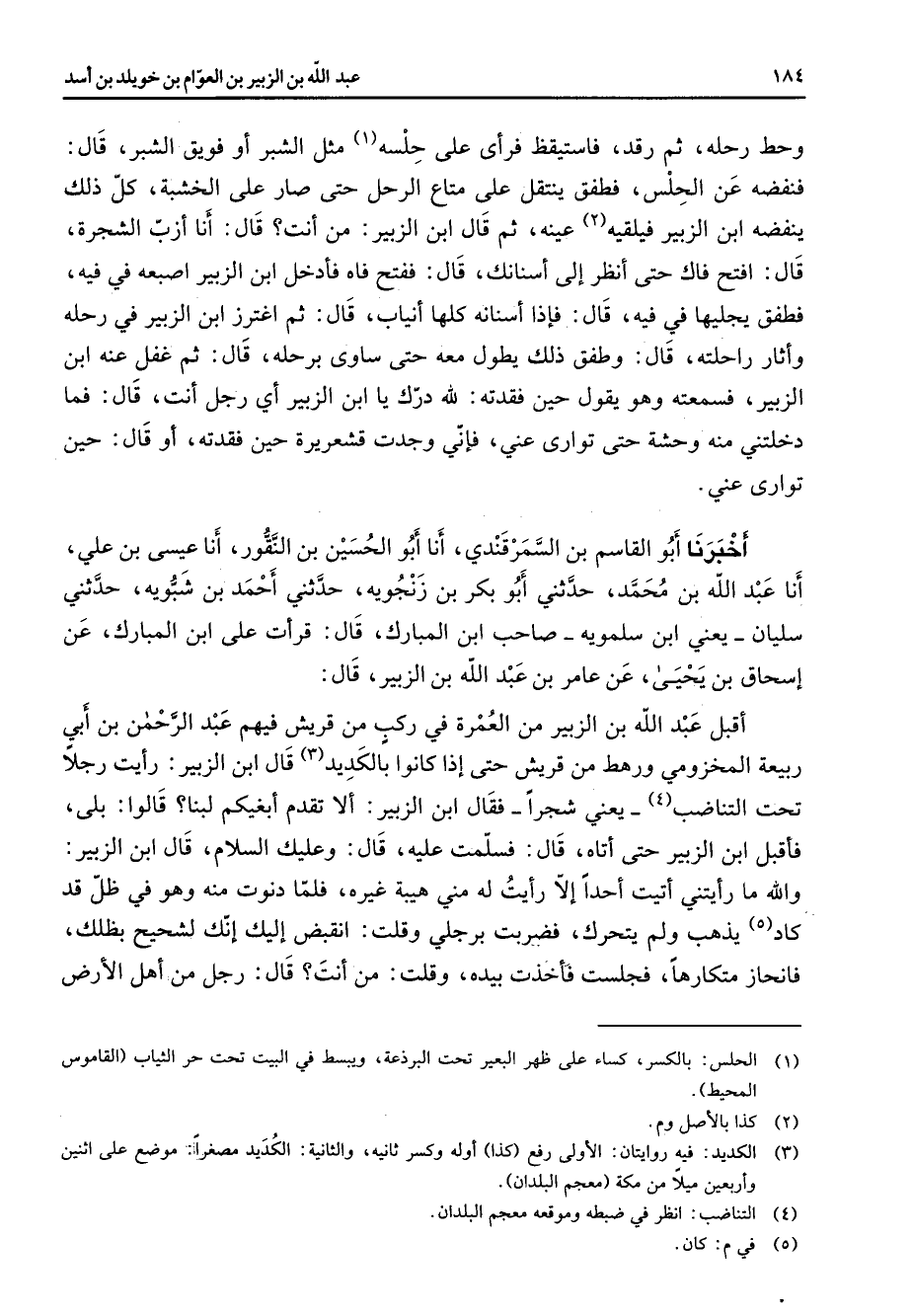 وحط رحله ثم رقد فاستيقظ فرأى على حلسه (1) مثل الشبر أو فويق الشبر قال فنفضه عن الحلس فطفق ينتقل على متاع الرحل حتى صار على الخشبة كل ذلك ينفضه ابن الزبير قيلقيه (2) عينه ثم قال ابن الزبير من انت قال أنا ازب الشجرة قال افتح فاك حتى انظر إلى اسنانك قال ففتح فاه فادخل ابن الزبير اصبعه في فيه فطفق يجليها في فيه قال فإذا اسنانه كلها انياب قال ثم اغترز ابن الزبير في رحله واثار راحلته قال وطفق ذلك يطول معه حتى ساوى برحله قال ثم غفل عنه ابن الزبير فسمعته وهو يقول حين فقدته لله درك يا ابن الزبير اي رجل انت قال فما دخلتني منه وحشة حتى توارى عني فاني وجدت قشعريرة حين فقدته أو قال حين توارى عني أخبرنا أبو القاسم بن السمرقندي أنا أبو الحسين بن النقور أنا عيسى بن علي أنا عبد الله بن محمد حدثني أبو بكر بن زنجوية حدثني أحمد بن شبوية حدثني سليان يعني ابن سلموية صاحب ابن المبارك قال قرأت على ابن المبارك عن إسحاق بن يحيى عن عامر بن عبد الله بن الزبير قال اقبل عبد الله بن الزبير من العمرة في ركب من قريش فيهم عبد الرحمن بن أبي ربيعة المخزومي ورهط من قريش حتى إذا كانوا بالكديد قال ابن الزبير رايت رجلا تحت التناضب (4) يعني شجرا فقال ابن الزبير الا تقدم ابغيكم لبنا قالوا بلى فاقبل ابن الزبير حتى اتاه قال فسلمت عليه قال وعليك السلام قال ابن الزبير والله ما رأيتني اتيت احدا الا رايت له مني هيبة غيره فلما دنوت منه وهو في ظل قد كاد (5) يذهب ولم يتحرك فضربت برجلي وقلت انقبض اليك انك لشحيح بظلك فانحاز متكارها فجلست فاخذت بيده وقلت من انت قال رجل من اهل الارض