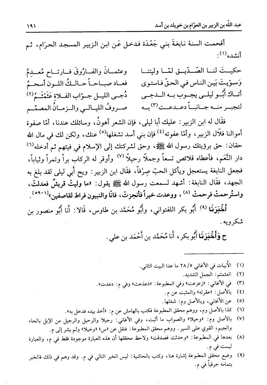 اقحمت السنة نابغة بني جعدة فدخل عن ابن الزبير المسجد الحرام ثم انشده (1) * حكيت لنا الصديق لما وليتنا * وعثمان والفاروق فارتاح معدم وسويت بين الناس في الحق فاستوى * فعاد صباحا حالك اللون اسحم اتاك أبو ليلى يجوب به الدجى * دجى الليل جواب الفلاة عثمثم (2) لتجبر منه جانبا دعدعت (3) به * صروف الليالي والزمان المصمم * فقال له ابن الزبير عليك أبا ليلى فان الشعر اهون وسائلك عندنا اما صفوة اموالنا فلآل الزبير واما عفوته (4) فان بني اسد تشغلها (5) عنك ولكن لك في مال الله حقان حق برؤيتك رسول الله (صلى الله عليه وسلم) وحق لشركتك إلى الاسلام في فيئهم ثم ادخله (6) دار النعم فاعطاه قلائص تسعا وجملا رحيلا (7) واوقر له الركاب برا وتمرا وثيأبا فجعل النابغة يستعجل وياكل الحب صرفا فقال ابن الزبير ويح أبي ليلى لقد بلغ به الجهد فقال النابغة اشهد لسمعت رسول الله (صلى الله عليه وسلم) يقول ما وليت قريش فعدلت واسترحمت فرحمت (8) ووعدت خيرا فانجزت فأنا والنبيون فراط لقاصفين أخبرنا (9) أبو بكر اللفتواني وأبو محمد بن طاوس قالا أنا أبو منصور بن شكرويه ح وأخبرنا أبو بكر أنا محمد بن أحمد بن علي