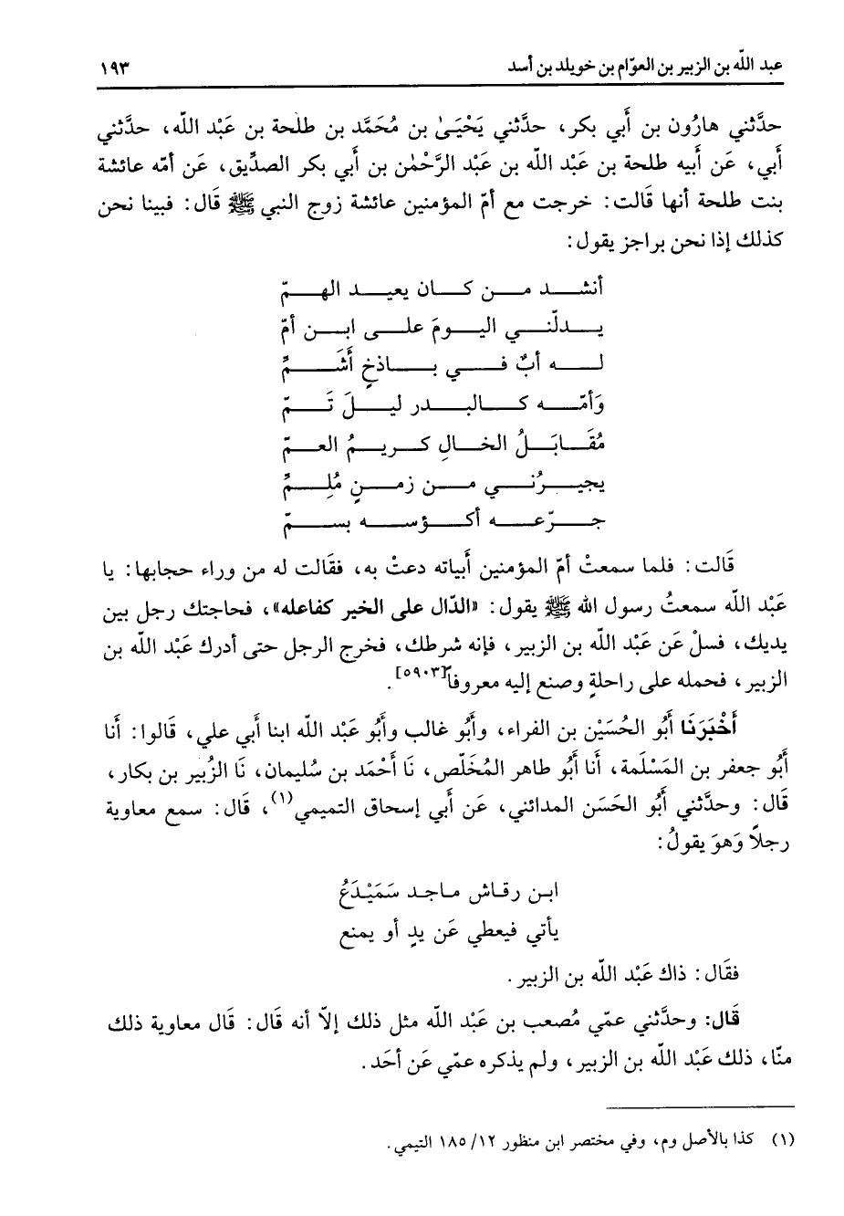 حدثني هارون بن أبي بكر حدثني يحيى بن محمد بن طلحة بن عبد الله حدثني أبي عن أبيه طلحة بن عبد الله بن عبد الرحمن بن أبي بكر الصديق عن امه عائشة بنت طلحة انها قالت خرجت مع ام المؤمنين عائشة زوج النبي (صلى الله عليه وسلم) قال فبينا نحن كذلك إذا نحن براجز يقول * انشد من كان يعيد الهم * يدلني اليوم على ابن ام * له اب في باذخ اشم * وامه كالبدر ليل تم * مقابل الخال كريم العم * يجيرني من زمن ملم * جرعه اكؤسه بسم قالت فلما سمعت ام المؤمنين أبياته دعت به فقالت له من وراء حجابها يا عبد الله سمعت رسول الله (صلى الله عليه وسلم) يقول الدال على الخير كفاعله فحاجتك رجل بين يديك فسل عن عبد الله بن الزبير فانه شرطك فخرج الرجل حتى ادرك عبد الله بن الزبير فحمله على راحلة وصنع إليه معروفا أخبرنا أبو الحسين بن الفراء وأبو غالب وأبو عبد الله ابنا أبي علي قالوا أنا