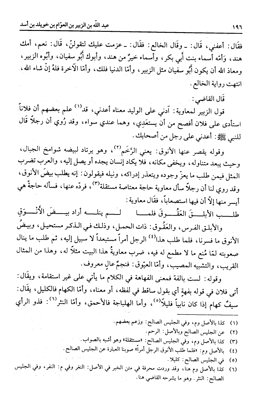 فقال اعفني قال وقال الخالع فقال عزمت عليك لتقولن قال نعم امك هند وامه اسماء بنت أبي بكر واسماء خير من هند وابوك أبو سفيان وابوه الزبير ومعاذ الله ان يكون أبو سفيان مثل الزبير واما الدنيا فلك واما الآخرة فله ان شاء الله انتهت رواية الخالع قال القاضي قول الزبير لمعاوية آدني على الوليد معناه اعدني قد (1) علم بعضهم ان فلانا استأدى على فلان افصح من ان يستعدي وهما عندي سواء وقد روي ان رجلا قال للنبي (صلى الله عليه وسلم) اعدني على رجل من اصحابك وقوله يقصر عنها الانوق يعني الرخم (2) وهو يرتاد لبيضه شوامخ الجبال وحيث يبعد متناوله ويخفى مكانه فلا يكاد انسان يجده أو يصل إليه والعرب تضرب المثل فيمن طلب ما يعز وجوده ويتعذر ادراكه ونيله فيقولون انه يطلب بيض الانوق وقد روي لنا ان رجلا سأل معاوية حاجة معتاصة مستقلة فرده عنها فسأله حاجة هي أيسر منها الا ان فيها استصعابا فقال معاوية * طلب الابلق العقوق فلما * لم ينله اراد بيض الانوق * والابلق الفرس والعقوق ذات الحمل وذلك في الذكر مستحيل وبيض الانوق ما فسرنا فلما طلب هذا (4) الرجل امرا مستبعدا لا سبيل إليه ثم يطلب ما ينال صعوبته لما منع ما لا مطمع له فيه ضرب معاوية هذا البيت مثلا له وهذا من المثال القريب والتشبيه المصيب واما العيوق فنجم عال معروف وقوله لست بالغة فمعنى الفهاهة في الكلام ما ياتي على غير استقامة ويقال اتى فلان في قوله بفهة اي بقول ساقط في لفظه أو معناه واما الكهام فالكليل يقال سيف كهام إذا كان نابيا فليلا (5) واما الهلباجة فالاحمق واما النثر (6) فذو الراي