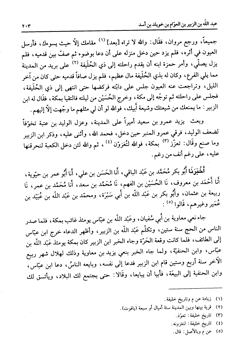 جميعا ورجع مروان فقال والله لا تراه بعد (1) مقلمك الا حيث يسوءك فارسل العيون في اثره فلم يزد حين دخل منزله على ان دعا بوضوء ثم صف بين قدميه فلم يزل يصلي وامر حمزة ابنه ان يقدم راحلته إلى ذي الحليفة (2) على بريد من المدينة مما يلي الفرع وكان له بذي الحليفة مال عظيم فلم يزل صافا قدميه حتى كان من آخر الليل وتراجعت عنه العيون جلس على دابته فركضها حتى انتهى إلى ذي الحليفة فجلس على راحلته ثم توجه إلى مكة وخرج الحسين من ليلته فالتقيا بمكة فقال له ابن الزبير ما يمنعك من شيعتك وشيعة أبيك فوالله لو ان لي مثلهم ما وجهت الا إليهم وبعث يزيد عمرو بن سعيد اميرا على المدينة وعزل الوليد بن عتبة تخوفا لضعف الوليد فرقي عمرو المنبر حين دخل فحمد الله واثنى عليه وذكر ابن الزبير وما صنع وقال تعزز (3) بمكة فوالله لتعزون (4) ثم والله لئن دخل الكعبة لنحرقنها عليه على رغم انف من رغم أخبرنا أبو بكر محمد بن عبد الباقي أنا الحسن بن علي أنا أبو عمر بن حيوية أنا أحمد بن معروف نا الحسين بن الفهم نا محمد بن سعد أنا محمد بن عمر نا ربيعة بن عثمان وأبو بكر بن عبد الله بن أبي سبرة ومحمد بن عبد الله بن عبيد بن عمير وغيرهم قالوا (5) جاء نعي معاوية بن أبي سفيان وعبد الله بن عباس يومئذ غائب بمكة فلما صدر الناس من الحج سنة ستين وتكلم عبد الله بن الزبير واظهر الدعاء خرج ابن عباس إلى الطائف فلما كانت وقعة الحرة وجاء الخبر ابن الزبير كان بمكة يومئذ عبد الله بن عباس وابن الحنفية ولما جاء الخبر بنعي يزيد بن معاوية وذلك لهلال شهر ربيع الآخر سنة اربع وستين قام ابن الزبير فدعا إلى نفسه وبايعه الناس دعا ابن عباس وابن الحنفية إلى البيعة فأبيا ان يبايعا وقالا حتى يجتمع لك البلاد ويأتسق لك
