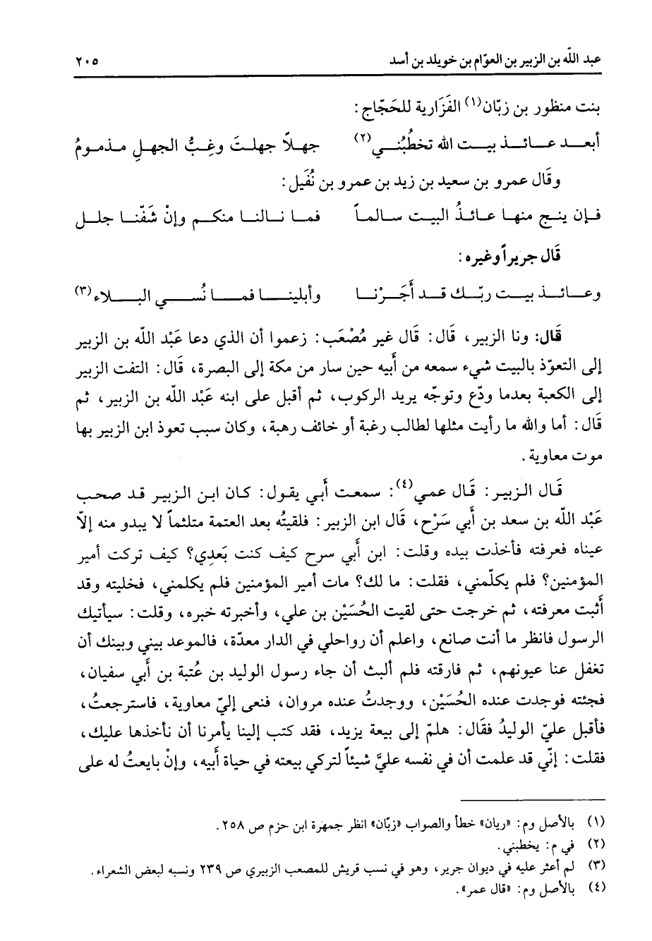 بنت منظور بن زبان (1) الفزارية للحجاج * ابعد عائذ بيت الله تخطبني (2) * جهلا جهلت وغب الجهل مذموم * وقال عمرو بن سعيد بن زيد بن عمرو بن نفيل * فان ينج منها عائذ البيت سألما * فما نالنا منكم وان شفنا جلل * قال جريرا وغيره * وعائذ بيت ربك قد اجرنا * وابلينا فما نسي البلاء (3) * قال ونا الزبير قال قال غير مصعب زعموا ان الذي دعا عبد الله بن الزبير إلى التعوذ بالبيت شئ سمعه من أبيه حين سار من مكة إلى البصرة قال التفت الزبير إلى الكعبة بعدما ودع وتوجه يريد الركوب ثم اقبل على ابنه عبد الله بن الزبير ثم قال اما والله ما رايت مثلها لطالب رغبة أو خائف رهبة وكان سبب تعوذ ابن الزبير بها موت معاوية قال الزبير قال عمي (4) سمعت أبي يقول كان ابن الزبير قد صحب عبد الله بن سعد بن أبي سرح قال ابن الزبير فلقيته بعد العتمة متلثما لا يبدو منه الا عيناه فعرفته فاخذته بيده وقلت ابن أبي سرح كيف كنت بعدي كيف تركت امير المؤمنين فلم يكلمني فقلت ما لك مات امير المؤمنين فلم يكلمني فخليته وقد اثبت معرفته ثم خرجت حتى لقيت الحسين بن علي واخبرته خبره وقلت سيأتيك الرسول فانظر ما انت صانع واعلم ان رواحلي في الدار معدة فالموعد بيني وبينك ان تغفل عنا عيونهم ثم فارقته فلم البث ان جاء رسول الوليد بن عتبة بن أبي سفيان فجئته فوجدت عنده الحسين ووجدت عنده مروان فنعى الي معاوية فاسترجعت فاقبل علي الوليد فقال هلم إلى بيعة يزيد فقد كتب الينا يامرنا ان ناخذها عليك فقلت اني قد علمت ان في نفسه علي شيئا لتركي بيعته في حياة أبيه وان بايعت له على