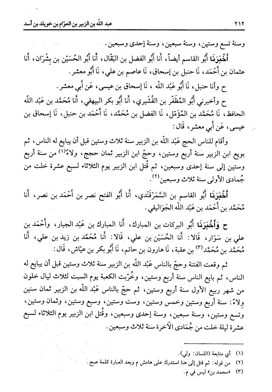 وسنة سبعين وسنة احدى وسبعين أخبرنا أبو القاسم ايضا أنا أبو الفضل بن البقال أنا أبو الحسين بن بشران أنا عثمان بن أحمد نا حنبل بن إسحاق نا عاصم بن علي نا أبو معشر ح وأنا حنبل نا أبو عبد الله نا إسحاق بن عيسى عن أبي معشر ح واخبرني أبو المظفر بن القشيري أنا أبو بكر البيهقي أنا محمد بن عبد الله الحافظ نا محمد بن المؤمل نا الفضل بن محمد نا أحمد بن حنبل نا إسحاق بن عيسى عن أبي معشر قال واقام للناس الحج عبد الله بن الزبير سنة ثلاث وستين قبل ان يبايع له الناس ثم بويع ابن الزبير سنة اربع وستين وحج ابن الزبير ثمان حجج ولاء (1) من سنة اربع وستين إلى سنة احدى وسبعين ثم قتل ابن الزبير يوم الثلاثاء لسبع عشرة خلت من جمادى الاولى سنة ثلاث وسبعين (2) أخبرنا أبو القاسم بن السمرقندي أنا أبو الفتح نصر بن أحمد بن نصر أنا محمد بن أحمد بن عبد الله الجواليقي ح وأخبرنا أبو البركات؟ وبن المبارك أنا المبارك بن عبد الجبار وأحمد بن علي بن سوار قالا أنا الحسين بن علي قالا أنا محمد بن زيد بن علي أنا محمد بن محمد (3) بن عقبة نا هارون بن حاتم نا أبو بكر بن عياش قال ثم وقعت الفتنة وحج بالناس عبد الله بن الزبير سنة ثلاث وستين قبل ان يبايع له الناس ثم بايع الناس سنة اربع وستين وخربت الكعبة يوم السبت لثلاث ليال خلون من شهر ربيع الاول سنة اربع وستين ثم حج بالناس عبد الله بن الزبير ثمان سنين ولاء سنة اربع وستين وخمس وستين وست وستين وسبع وسبعين وثمان وستين وتسع وستين وسنة سبعين وسنة احدى وسبعين وقتل ابن الزبير يوم الثلاثاء لسبع عشرة ليلة خلت من جمادى الآخرة سنة ثلاث وسبعين