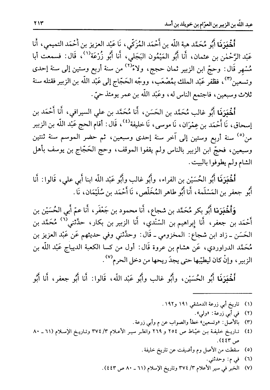 أخبرنا أبو محمد هبة الله بن أحمد المزكي نا عبد العزيز بن أحمد التميمي أنا عبد الرحمن بن عثمان أنا أبو الميمون البجلي أنا أبو زرعة (1) قال فسمعت أبا مسهر قال وحج ابن الزبير ثمان حجج ولاء (2) من سنة اربع وستين إلى سنة احدى وتسعين (3) فظفر عبد الملك بمصعب ووجه الحجاج إلى عبد الله بن الزبير فقتله سنة ثلاث وسبعين فاجتمع الناس له وعبد الله بن عمر يومئذ حي أخبرنا أبو غالب محمد بن الحسن أنا محمد بن علي السيرافي أنا أحمد بن إسحاق نا أحمد بن عمران نا موسى نا خليفة (4) قال اقام الحج عبد الله بن الزبير من (5) سنة اربع وستين إلى آخر سنة احدى وسبعين ثم حضر الموسم سنة ثنتين وسبعين فحج ابن الزبير بالناس ولم يقفوا الموقف وحج الحجاج بن يوسف باهل الشام ولم يطوفوا بالبيت أخبرنا أبو الحسين بن الفراء وأبو غالب وأبو عبد الله ابنا أبي علي قالوا أنا أبو جعفر بن المسلمة أنا أبو طاهر المخلص نا أحمد بن سليمان نا وأخبرنا أبو بكر بن شجاع أنا محمود بن جعفر أنا عم أبي الحسين بن أحمد بن جعفر أنا إبراهيم بن السندي أنا الزبير بن بكار حدثني (6) محمد بن الحسن زاد ابن شجاع المخزومي قال وحدثني وفي حديثهم عن عبد العزيز بن محمد الدراوردي عن هشام بن عروة قال اول من كسا الكعبة الديباج عبد الله بن الزبير وان كان ليطيبها حتى يجد ريحها من دخل الحرم (7) أخبرنا أبو الحسين وأبو غالب وأبو عبد الله قالوا أنا أبو جعفر أنا أبو