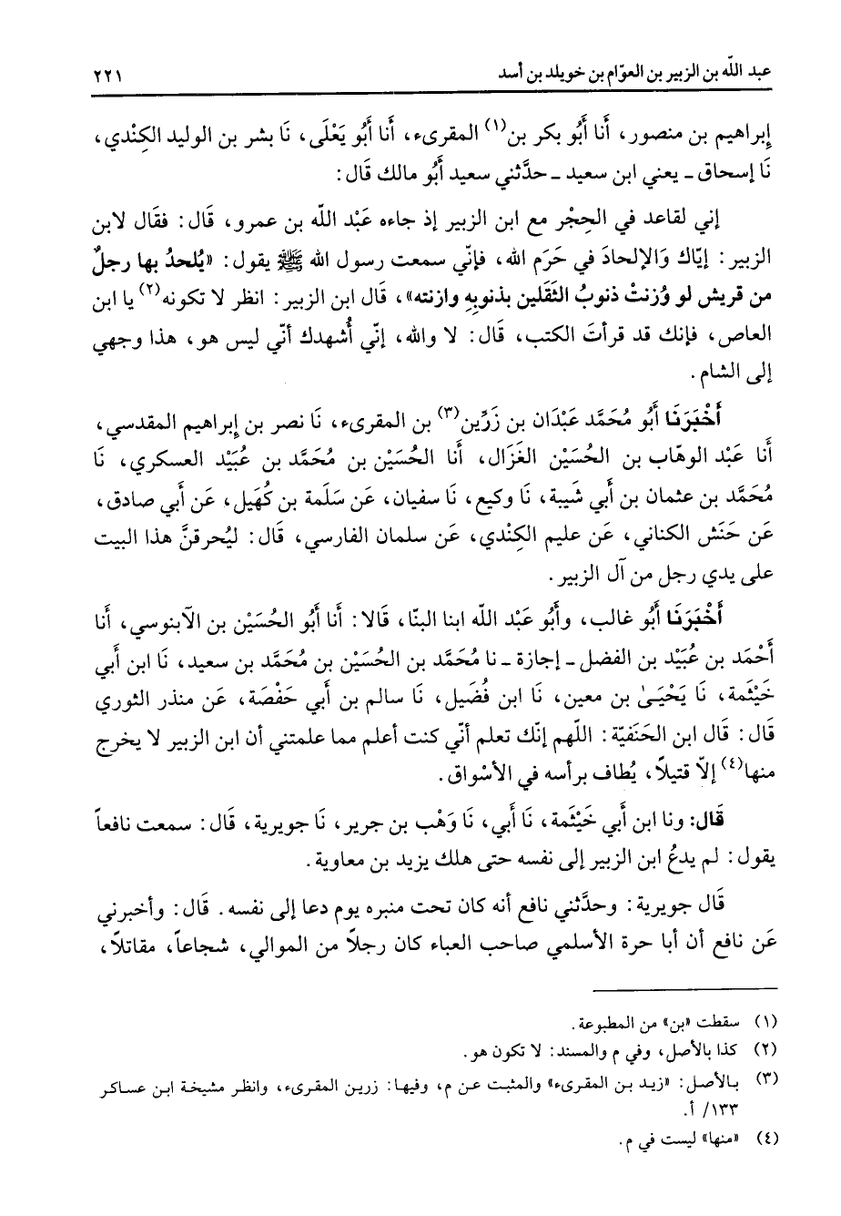 أحمد بن عبيد بن الفضل اجازة نا محمد بن الحسين بن محمد بن سعيد نا ابن أبي خيثمة نا يحيى بن معين نا ابن فضيل نا سألم بن أبي حفصة عن منذر الثوري قال قال ابن الحنفية اللهم انك تعلم اني كنت اعلم مما علمتني ان ابن الزبير لا يخرج منها (4) الا قتيلا يطاف براسه في الاسواق قال ونا ابن أبي خيثمة نا أبي نا وهب بن جرير نا جويرية قال سمعت نافعا يقول لم يدع ابن الزبير إلى نفسه حتى هلك يزيد بن معاوية قال جويرية وحدثني نافع انه كان تحت منبره يوم دعا إلى نفسه قال واخبرني عن نافع ان أبا حرة الاسلمي صاحب العباء كان رجلا من الموالي شجاعا مقاتلا