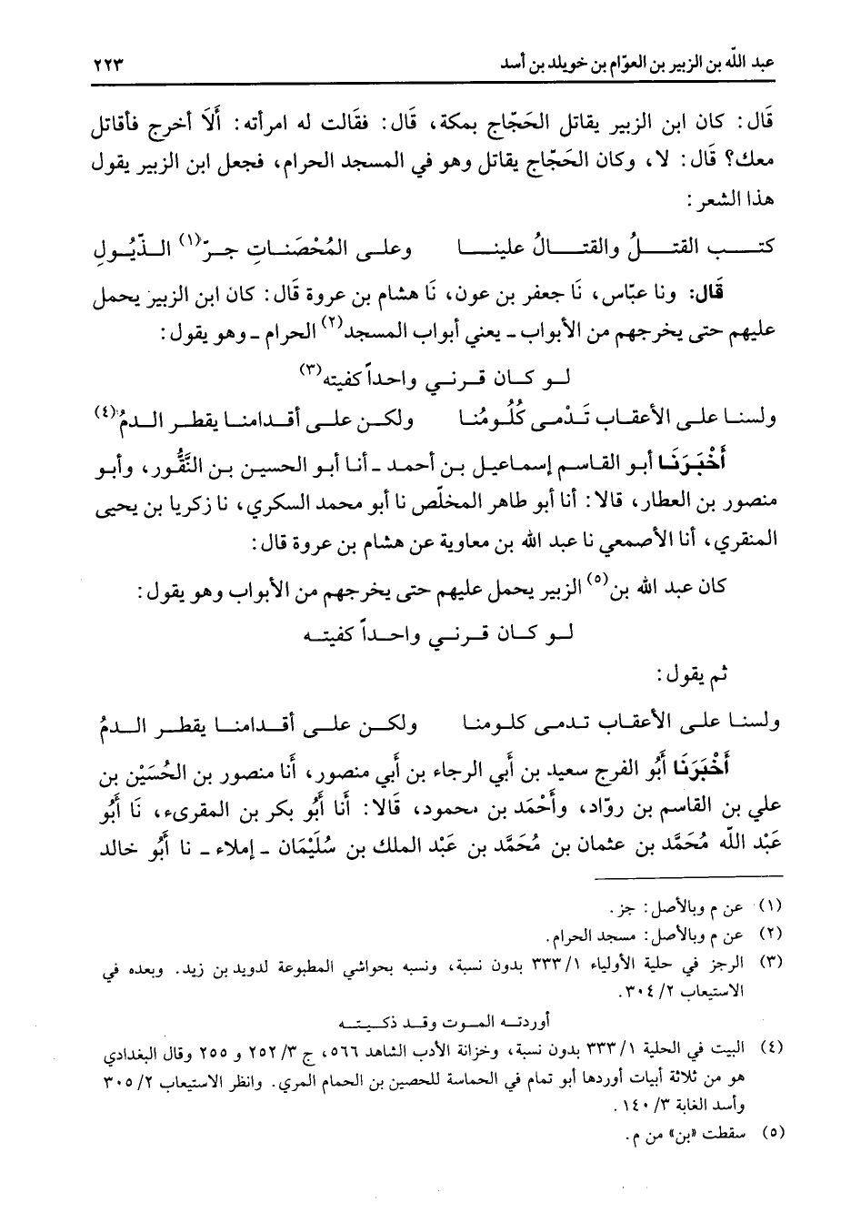 قال كان ابن الزبير يقاتل الحجاج بمكة قال فقالت له امراته الا اخرج فاقاتل معك قال لا وكان الحجاج يقاتل وهو في المسجد الحرام فجعل ابن الزبير يقول هذا الشعر * كتب القتل والقتال علينا * وعلى المحصنات جر (1) الذيول * قال ونا عباس نا جعفر بن عون نا هشام بن عروة قال كان ابن الزبير يحمل عليهم حتى يخرجهم من الابواب يعني ابواب المسجد (2) الحرام وهو يقول * لو كان قرني واحدا كفيته (3) * ولسنا على الاعقاب تدمى كلومنا * ولكن على اقدامنا يقطر الدم (4) * أخبرنا أبو القاسم إسماعيل بن أحمد أنا أبو الحسين بن النقور وأبو منصور بن العطار قالا أنا أبو طاهر المخلص نا أبو محمد السكري نا زكريا بن يحيى المنقري أنا الاصمعي نا عبد الله بن معاوية عن هشام بن عروة قال كان عبد الله بن (5) الزبير يحمل عليهم حتى يخرجهم من الابواب وهو يقول * لو كان قرني واحدا كفيته ثم يقول * ولسنا على الاعقاب تدمى كلومنا * ولكن على اقدامنا يقطر الدم * أخبرنا أبو الفرج سعيد بن أبي الرجاء بن أبي منصور أنا منصور بن الحسين بن علي بن القاسم بن رواد وأحمد بن محمود قالا أنا أبو بكر بن المقرئ نا أبو عبد الله محمد بن عثمان بن محمد بن عبد الملك بن سليمان املاء نا أبو خالد