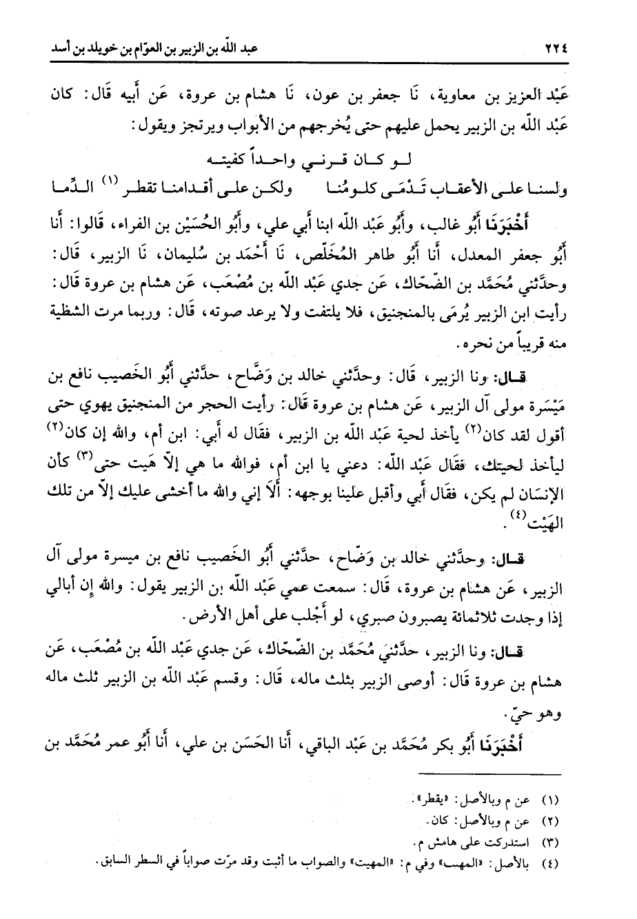 عبد العزيز بن معاوية نا جعفر بن عون نا هشام بن عروة عن أبيه قال كان عبد الله بن الزبير يحمل عليهم حتى يخرجهم من الابواب ويرتجز ويقول * لو كان قرني واحدا كفيته * ولسنا على الاعقاب تدمى كلومنا * ولكن على اقدامنا تقطر (1) الدما * أخبرنا أبو غالب وأبو عبد الله ابنا أبي علي وأبو الحسين بن الفراء قالوا أنا أبو جعفر المعدل أنا أبو طاهر المخلص نا أحمد بن سليمان نا الزبير قال وحدثني محمد بن الضحاك عن جدي عبد الله بن مصعب عن هشام بن عروة قال رايت ابن الزبير يرمى بالمنجنيق فلا يلتفت ولا يرعد صوته قال وربما مرت الشظية منه قريبا من نحره قال ونا الزبير قال حدثني خالد بن وضاح حدثني أبو الخصيب نافع بن ميسرة مولى آل الزبير عن هشام بن عروة قال رايت الحجر من المنجنيق يهوى حتى اقول لقد كان (2) ياخذ لحية عبد الله بن الزبير فقال له أبي ابن ام والله ان كان (2) لياخذ لحيتك فقال عبد الله دعني يا ابن ام فوالله ما هي الا هيت حتى (3) كان الانسان لم يكن فقال أبي واقبل علينا بوجهه الا اني والله ما اخشى عليك الا من تلك الهيت (4) قال وحدثني خالد بن وضاح حدثني أبو الخصيب نافع بن ميسرة مولى آل الزبير عن هشام بن عروة قال سمعت عمي عبد الله بن الزبير يقول والله ان أبالي إذا وجدت ثلاثمائة يصبرون صبري لو اجلب على اهل الارض قال ونا الزبير حدثني محمد بن الضحاك عن جدي عبد الله بن مصعب عن هشام بن عروة قال اوصى الزبير بثلث ماله قال وقسم عبد الله بن الزبير ثلث ماله وهو حي أخبرنا أبو بكر محمد بن عبد الباقي أنا الحسن بن علي أنا أبو عمر محمد بن
