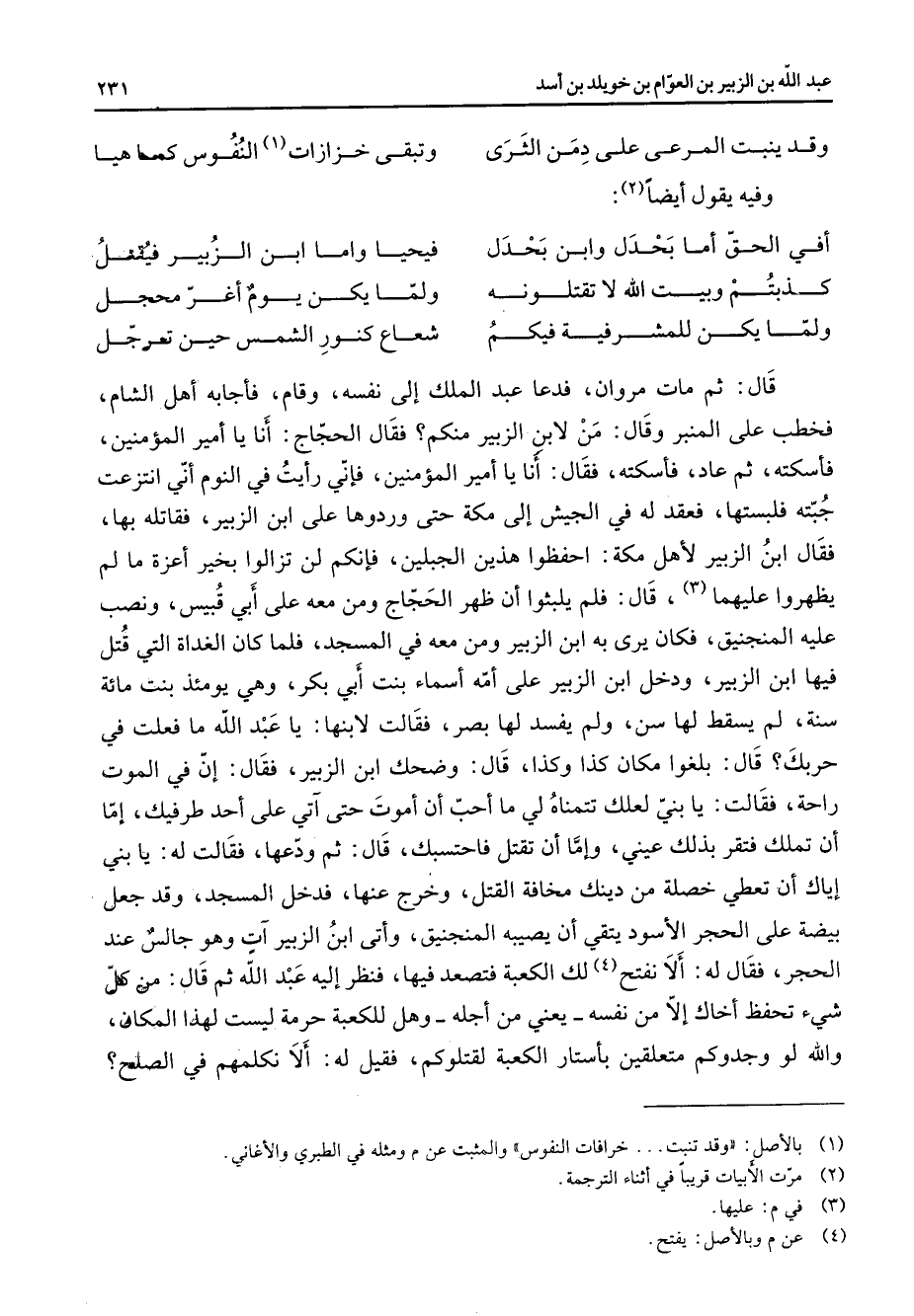 وقد ينبت المرعى على دمن الثرى * وتبقى خزازات (1) النفوس كما هيا * وفيه يقول ايضا (2) * أفي الحق اما بحدل وابن بحدل * فيحيا واما ابن الزبير فيقتل كذبتم وبيت الله لا تقتلونه * ولما يكن يوم اغر محجل ولما يكن للمشرفية فيكم * شعاع كنور الشمس حين ترجل * قال ثم مات مروان فدعا عبد الملك إلى نفسه وقام فاجابه اهل الشام فخطب على المنبر وقال من لابن الزبير منكم فقال الحجاج أنا يا امير المؤمنين فاسكته ثم دعا فاسكته فقال أنا يا امير المؤمنين فاني رايت في النوم اني انتزعت جبته فلبستها فعقد له في الجيش إلى مكة حتى وردوها على ابن الزبير فقاتله بها فقال ابن الزبير لاهل مكة احفظوا هذين الجبلين فانكم لن تزالوا بخير اعزة ما لم يظهروا عليهما (3) قال فلم يلبثوا ان ظهر الحجاج ومن معه على أبي قبيس ونصب عليه المنجنيق فكان يرى به ابن الزبير ومن معه في المسجد فلما كان الغداة التي قتل فيها ابن الزبير ودخل ابن الزبير على امه اسماء بنت أبي بكر وهي يومئذ بنت مائة سنة لم يسقط لها سن ولم يفسد لها بصر فقالت لابنها يا عبد الله ما فعلت في حربك قال بلغوا مكان كذا وكذا قال وضحك ابن الزبير فقال ان في الموت راحة فقالت يا بني لعلك تتمناه لي ما احب ان اموت حتى آتي على احد طرفيك اما ان تملك فتقر بذلك عيني واما ان تقتل فاحتسبك قال ثم ودعها فقالت له يا بني اياك ان تعطي خصلة من دينك مخافة القتل وخرج عنها فدخل المسجد وقد جعل بيضة على الحجر الاسود يتقي ان يصيبه المنجنيق واتى ابن الزبير آت وهو جالس عند الحجر فقال له الا نفتح لك الكعبة فتصعد فيها فنظر إليه عبد الله ثم قال من كل شئ تحفظ اخاك الا من نفسه يعني من اجله وهل للكعبة حرمة ليست لهذا المكان والله لو وجدوكم متعلقين باستار الكعبة لقتلوكم فقيل له الا نكلمهم في الصلح؟