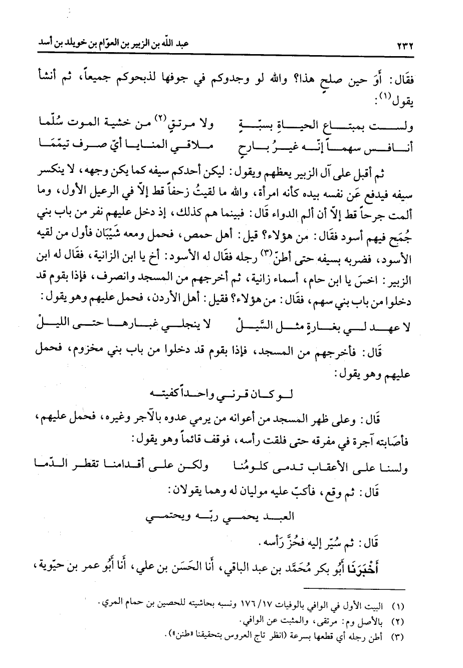 فقال أو حين صلح هذا والله لو وجدوكم في جوفها لذبحوكم جميعا ثم انشأ يقول (1) * ولست بمبتاع الحياة بسبة * ولا مرتق (2) من خشية الموت سلما أنافس سهما انه غير بارح * ملاقي المنايا اي صرف تيمما * ثم اقبل على آل الزبير يعظهم ويقول ليكن احدكم سيفه كما يكن وجهه لا ينكسر سيفه فيدفع عن نفسه بيده كانه امراة والله ما لقيت زحفا قط الا في الرعيل الاول وما الميت جرحا قط الا ان ألم الدواء قال فبينما هم كذلك إذ دخل عليهم نفر من باب بني جمح فيهم اسود فقال من هؤلاء قيل اهل حمص فحمل ومعه شيبان فاول من لقيه الاسود فضربه بسيفه حتى اطن (3) رجله فقال له الاسود اخ يا ابن الزانية فقال له ابن الزبير اخس يا ابن حام اسماء زانية ثم اخرجهم من المسجد وانصرف فإذا بقوم قد دخلوا من باب بني سهم فقال من هؤلاء فقيل اهل الاردن فحمل عليهم وهو يقول * لا عهد لي بغارة مثل السيل * لا ينجلي غبارها حتى الليل * قال فاخرجهم من المسجد فإذا بقوم قد دخلوا من باب بني مخزوم فحمل عليهم وهو يقول * لو كان قرني واحدا كفيته قال وعلى ظهر المسجد من اعوانه من يرمي عدوه بالآجر وغيره فحمل عليهم فاصابته آجره في مفرقه حتى فلقت راسه فوقف قائما وهو يقول * ولسنا على الاعقاب تدمى كلومنا * ولكن على اقدامنا تقطر الدما * قال ثم وقع فاكب عليه موليان له وهما يقولان * العبد يحمي ربه ويحتمي قال ثم سير إليه فحز راسه أخبرنا أبو بكر محمد بن عبد الباقي أنا الحسن بن علي أنا أبو عمر بن حيوية