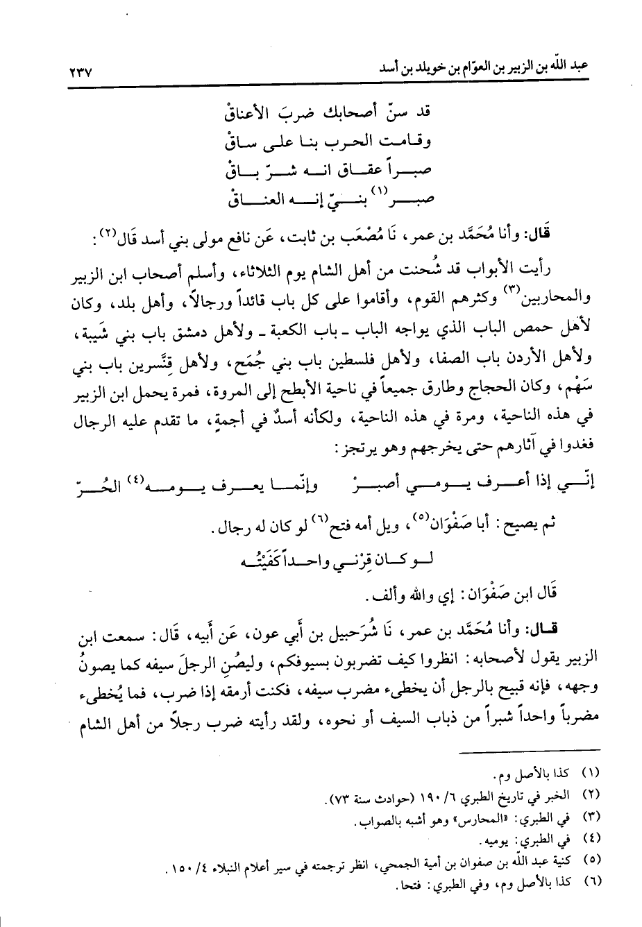 * قد سن اصحابك ضرب الاعناق * وقامت الحرب بنا على ساق * صبرا عقاق انه شر باق * صبر (1) بني انه العناق قال وأنا محمد بن عمر نا مصعب بن ثابت عن نافع مولى بني اسد قال (2) رايت الابواب قد شحنت من اهل الشام يوم الثلاثاء واسلم اصحاب ابن الزبير والمحاربين (3) وكثرهم القوم واقاموا على كل باب قائدا ورجالا واهل بلد وكان لاهل حمص الباب الذي يواجه الباب باب الكعبة ولاهل دمشق باب بني شيبة ولاهل الاردن باب الصفا ولاهل فلسطين باب بني جمح ولاهل قنسرين باب بني سهم وكان الحجاج وطارق جميعا في ناحية الابطح إلى المروة فمرة يحمل ابن الزبير في هذه الناحية ومرة في هذه الناحية ولكانه اسد في اجمة ما تقدم عليه الرجال فغدوا في آثارهم حتى يخرجهم وهو يرتجز * اني إذا اعرف يومي اصبر * وانما يعرف يومه (4) الحر * ثم يصيح أبا صفوان (5) ويل امه فتح (6) لو كان له رجال * لو كان قرني واحدا كفيته قال ابن صفوان اي والله والف قال وأنا محمد بن عمر نا شرحبيل بن أبي عون عن أبيه قال سمعت ابن الزبير يقول اصحابه انظروا كيف تضربون بسيوفكم وليصن الرجل سيفه كما يصون وجهه فانه قبيح بالرجل ان يخطئ مضرب سيفه فكنت ارمقه إذا ضرب فما يخطئ مضربا واحدا شبرا من ذباب السيف أو نحوه ولقد رايته ضرب رجلا من اهل الشام