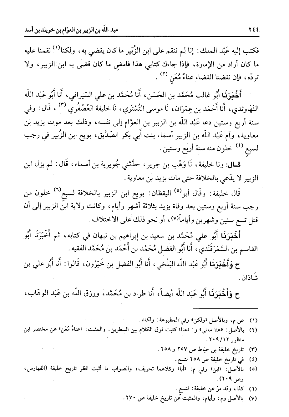 فكتب إليه عبد الملك أنا لم ننقم على ابن الزبير ما كان يقضي به ولكنا (1) نقمنا عليه ما كان اراد من الامارة فإذا جاءك كتابي هذا فامض ما كان قضى به ابن الزبير ولا ترده فان نقضنا القضاء عناء معن (2) أخبرنا أبو غالب محمد بن الحسن أنا محمد بن علي السيرافي أنا أبو عبد الله النهاوندي أنا أحمد بن عمران نا موسى التستري نا خليفة العصفري (3) قال وفي سنة اربع وستين دعا عبد الله بن الزبير بن العوام إلى نفسه وذلك بعد موت يزيد بن معاوية وام عبد الله بن الزبير اسماء بنت أبي بكر الصديق بويع ابن الزبير في رجب لسبع (4) خلون منه سنة اربع وستين قال ونا خليفة نا وهب بن جرير حدثني جويرية بن اسماء قال لم يزل ابن الزبير لا يدعي بالخلافة حتى مات يزيد بن معاوية قال خليفة وقال أبو (5) اليقظان بويع ابن الزبير بالخلافة لسبع (6) خلون من رجب سنة اربع وستين بعد وفاة يزيد بثلاثة اشهر وايام وكانت ولاية ابن الزبير إلى ان قتل تسع سنين وشهرين واياما (7) أو نحو ذلك على الاختلاف أخبرنا أبو علي محمد بن سعيد بن إبراهيم بن نبهان في كتابه ثم أخبرنا أبو القاسم بن السمرقندي أنا أبو الفضل محمد بن أحمد بن محمد الفقيه ح وأخبرنا أبو عبد الله والبلخي أنا أبو الفضل بن خيرون قالوا أنا أبو علي بن شاذان ح وأخبرنا أبو عبد الله وايضا أنا طراد بن محمد ورزق الله بن عبد الوهاب