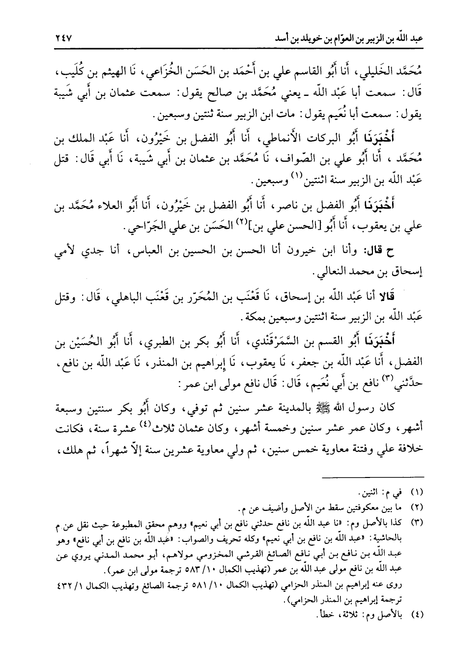 محمد الخليلي أبا أبو القاسم علي بن أحمد بن الحسن الخزاعي نا الهيثم بن كليب قال سمعت أبا عبد الله يعني محمد بن صالح يقول سمعت عثمان بن أبي شيبة يقول سمعت أبا نعيم يقول مات ابن الزبير سنة ثنتين وسبعين أخبرنا أبو البركات الانماطي أنا أبو الفضل بن خيرون أنا عبد الملك بن محمد أنا أبو علي بن الصواف نا محمد بن عثمان بن أبي شيبة نا أبي قال قتل عبد الله بن الزبير سنة اثنتين (1) وسبعين أخبرنا أبو الفضل بن ناصر أنا أبو الفضل بن خيرون أنا أبو العلاء محمد بن علي بن يعقوب أنا أبو الحسن علي (2) بن الحسن بن علي الجراحي ح قال وأنا ابن خيرون أنا الحسن بن الحسين بن العباس أنا جدي لامي إسحاق بن محمد النعالي قالا أنا عبد الله بن إسحاق نا قعنب بن المحرر بن قعنب الباهلي قال وقتل عبد الله بن الزبير سنة اثنتين وسبعين بمكة أخبرنا أبو القاسم بن السمرقندي أنا أبو بكر بن الطبري أنا أبو الحسين بن الفضل أنا عبد الله بن جعفر نا يعقوب نا إبراهيم بن المنذر نا عبد الله بن نافع حدثني (3) نافع بن أبي نعيم قال قال نافع مولى ابن عمر كان رسول الله (صلى الله عليه وسلم) بالمدينة عشر سنين ثم توفي وكان أبو بكر سنتين وسبعة اشهر وكان عمر عشر سنين وخمسة اشهر وكان عثمان ثلاث (4) عشرة سنة فكانت خلافة علي وفتنة معاوية خمس سنين ثم ولي معاوية عشرين سنة الا شهرا ثم هلك