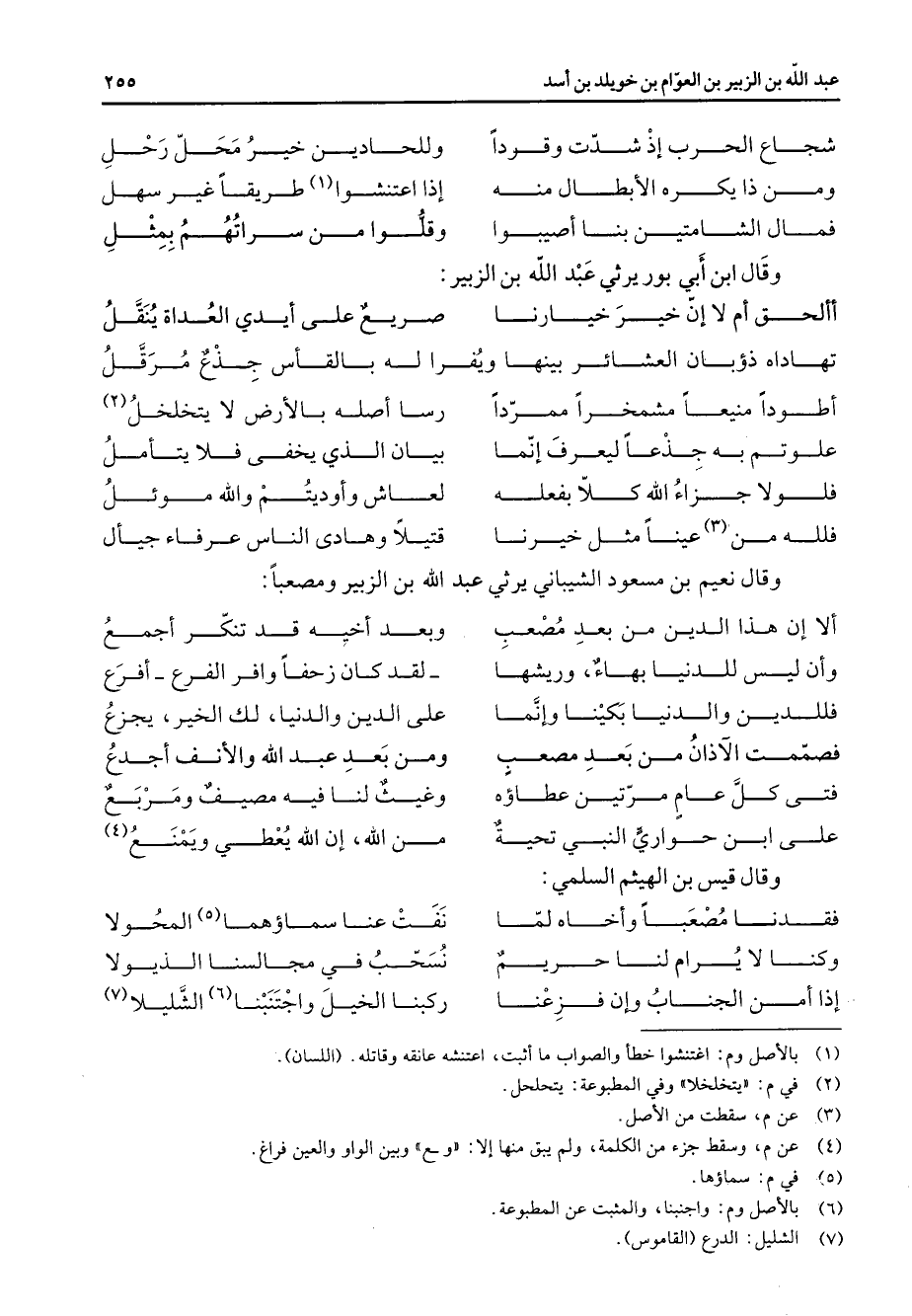 الا ان هذا الدين من بعد مصعب * وبعد اخيه قد تنكر اجمع وان ليس للدنيا بهاء وريشها * لقد كان زحفا وافر الفرع افرع فللدين والدنيا بكينا وانما * على الدين والدنيا لك الخير يجزع فصممت الآذان من بعد مصعب * ومن بعد عبد الله والانف اجدع فتى كل عام مرتين عطاؤه * وغيث لنا فيه مصيف ومربع على ابن حواري النبي تحية * من الله ان الله يعطي ويمنع * (4) وقال قيس بن الهيثم السلمي * فقدنا مصعبا واخاه لما * نفت عنا سماؤهما (5) المحولا وكنا لا يرام لنا حريم * نسحب في مجالسنا الذيولا إذا امن الجناب وان فزعنا * ركبنا الخيل واجتنبنا (6) الشليلا (7)