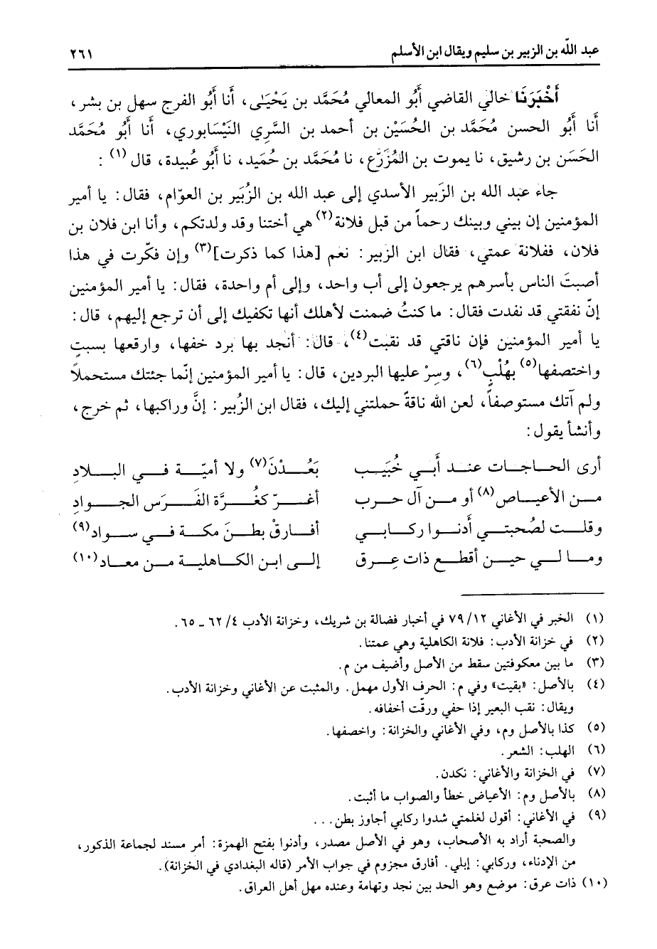 أخبرنا خالي القاضي أبو المعالي محمد بن يحيى أنا أبو الفرج سهل بن بشر أنا أبو الحسن محمد بن الحسين بن أحمد بن السري النيسابوري أنا أبو محمد الحسن بن رشيق نا يموت بن المزرع نا محمد بن حميد نا أبو عبيدة قال (1) جاء عبد الله بن الزبير الاسدي إلى عبد الله بن الزبير بن العوام فقال يا امير المؤمنين ان بيني وبينك رحما من قبل فلانة (2) هي اختنا وقد ولدتكم وأنا ابن فلان بن فلان ففلانة عمتي فقال ابن الزبير نعم هذا كما ذكرت وان فكرت (3) في هذا اصبت الناس باسرهم يرجعون إلى اب واحد وإلى ام واحدة فقال يا امير المؤمنين ان نفقتي قد نفذت فقال ما كنت ضمنت لاهلك انها تكفيك إلى ان ترجع إليهم قال يا امير المؤمنين فان ناقتي قد نقبت (4) قال انجد بها برد خفها وارقعها بسبت واختصفها (5) بهلب (6) وسر عليها البردين قال يا امير المؤمنين انما جئتك مستحملا ولم آتك مستوصفا لعن الله ناقة حملتني اليك فقال ابن الزبير ان وراكبها ثم خرج وانشأ يقول * ارى الحاجات عند أبي خبيب * بعدن (7) ولا امية في البلاد من الاعياص أو (8) من آل حرب * اغر كغرة الفرس الجواد وقلت لصحبتي ادنوا رقأبي * افارق بطن مكة في سواد (9) وما لي حين اقطع ذات عرق * إلى ابن الكاهلية من معاد (10) *