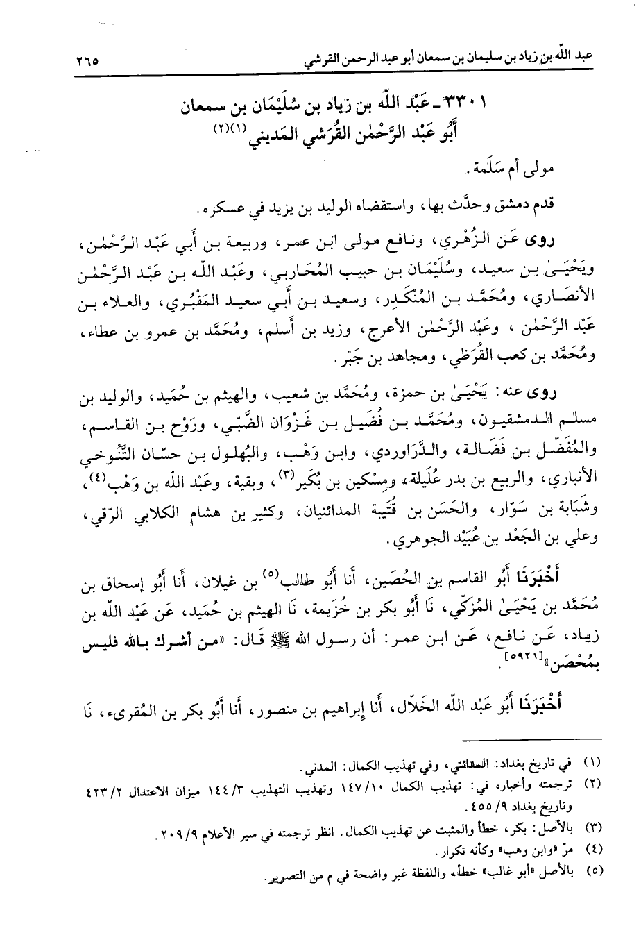 3301 - عبد الله بن زياد بن سليمان بن سمعان أبو عبد الرحمن القرشي المديني (1) (2) مولى ام سلمة قدم دمشق وحدث بها واستقضاه الوليد بن يزيد في عسكره روى عن الزهري ونافع مولى ابن عمر وربيعة بن أبي عبد الرحمن ويحيى بن سعيد وسليمان بن حبيب المحاربي وعبد الله بن عبد الرحمن الانصاري ومحمد بن المنكدر وسعيد بن أبي سعيد المقبري والعلاء بن عبد الرحمن وعبد الرحمن الاعرج وزيد بن اسلم ومحمد بن عمرو بن عطاء ومحمد بن كعب القرظي ومجاهد بن جبر روى عنه يحيى بن حمزة ومحمد بن شعيب والهيثم بن حميد والوليد بن مسلم الدمشقيون ومحمد بن فضيل بن غزوان الضبي وروح بن القاسم والمفضل بن فضالة والدراوردي وابن وهب والبهلول بن حسان التنوخي الانباري والربيع بن بدر عليلة ومسكين بن بكير (3) وبقية وعبد الله بن وهب (4) وشبابة بن سوار والحسن بن قتيبة المدائنيان وكثير بن هشام الكلابي الرقي وعلي بن الجعد بن عبيد الجوهري أخبرنا أبو القاسم بن الحصين أنا أبو طالب (5) بن غيلان أنا أبو إسحاق بن محمد بن يحيى المزكي نا أبو بكر بن خزيمة نا الهيثم بن حميد عن عبد الله بن زياد عن نافع عن ابن عمر ان رسول الله (صلى الله عليه وسلم) قال من اشرك بالله فليس بمحصن أخبرنا أبو عبد الله الخلال أنا إبراهيم بن منصور أنا أبو بكر بن المقرئ نا