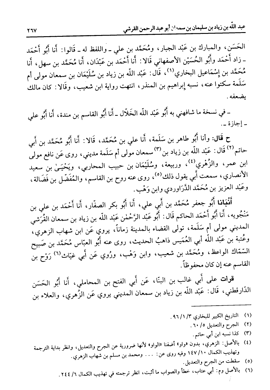 الحسن والمبارك بن عبد الجبار ومحمد بن علي واللفظ له قالوا أنا أبو أحمد زاد أحمد وأبو الحسين الاصفهاني قالا أنا أحمد بن عبدان أنا محمد بن سهل أنا محمد بن إسماعيل البخاري (1) قال عبد الله بن زياد بن سليمان بن سمعان مولى ام سلمة سكتوا عنه نسبه إبراهيم بن المنذر انتهت رواية ابن شعيب وقالا كان مالك يضعفه في نسخة ما شافهني به أبو عبد الله الخلال أنا أبو القاسم بن مندة أنا أبو علي اجازة ح قال وأنا أبو طاهر بن سلمة أنا علي بن محمد قالا أنا أبو محمد بن أبي حاتم (2) قال عبد الله بن زياد بن (3) سمعان مولى ام سلمة مديني روى عن نافع مولى ابن عمر والزهري (4) وربيعة وسليمان بن حبيب المحاربي ويحيى بن سعيد الانصاري سمعت أبي يقول ذلك (5) روى عنه روح بن القاسم والمفضل بن فضالة وعبد العزيز بن محمد الدراوردي وابن وهب انبأنا أبو جعفر محمد بن أبي علي أنا أبو بكر الصفار أنا أحمد بن علي بن منجويه أنا أبو أحمد الحاكم قال أبو عبد الرحمن عبد الله بن زياد بن سمعان القرشي المديني مولى ام سلمة تولى القضاء بالمدينة زمانا يروي عن ابن شهاب الزهري وعتبة بن عبد الله أبي العميس ذاهب الحديث روى عنه أبو العباس محمد بن صبيح السماك الواعظ ومحمد بن شعيب وابن وهب وروي عن أبي غياث (6) روح بن القاسم عنه ان كان محفوظا قرأت على أبي غالب بن البنا عن أبي الفتح بن المحاملي أنا أبو الحسن الدارقطني قال عبد الله بن زياد بن سمعان المديني يروي عن الزهري والعلاء بن