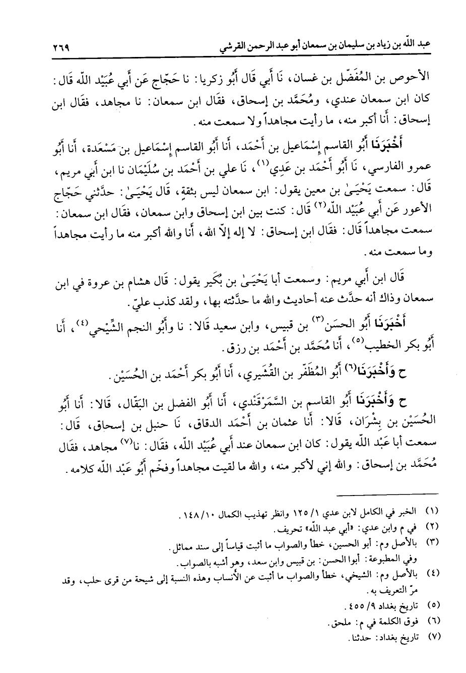 الأحوص بن المفضل بن غسان نا أبي قال أبو زكريا نا حجاج عنأبي عبيد الله قال كانت سمعان عندي ومحمد بن إسحاق فقال ابن سمعان نا مجاهد فقال ابن إسحاق أنا اكبر منه ما رأيت مجاهدا ولا سمعت منه أخبرنا أبو القاسم إسماعيل بن أحمد أنا أبو القاسم إسماعيل بن مسعدة أنا أبو عمرو الفارسي نا أبو أحمد بن عدي (1) نا علي بن أحمد بن سليمان نا ابن أبي مريم قال سمعت يحيى بن معين يقول ابن سمعان ليس بثقة قال يحية حدثني حجاج الأعور عنأبي عبيد الله (2) قال كنت بين ابن اسحاق وابن سمعان فقال ابن سمعان سمعت مجاهدا قال فقال ابن اسحاق لا إله إلا الله أنا والله أكبر منه ما رأيت مجاهدا وما سمعت منه قال ابن ابي مريم وسمعت أبا يحيى بن بكير يقول قال هشام بن عروة في ابن سمعان وذاك أنه حدث عنه أحاديث والله ما حدثته بها ولقد كذب علي أخبرنا أبو الحسن (3) بن قبيس وابن سعد قالا نا وأبو النجم الشيخي (4) أن أبو بكر الخطيب (5) أنا محمد بن أحمد بن رزق ح وأخبرنا (6) أبو المظفر بن القشيري أنا أبو بكر أحمد بن الحسين ح وأخبرنا أبو القاسم بن السمرقندي أنا أبو الفضل بن البقال قال أنا أبو الحسين بن بشران قالا أنا عثمان بن أحمد الدقاق نا حنبل بن إسحاق قال سمعت أبا عبد الله يقول كان ابن سمعان عند أبي عبيد الله فقال نا (7) مجاهد فقال محمد بن إسحاق والله إني لأكبر منه والله ما لقيت مجاهدا وفخم أبو عبد الله كلامه