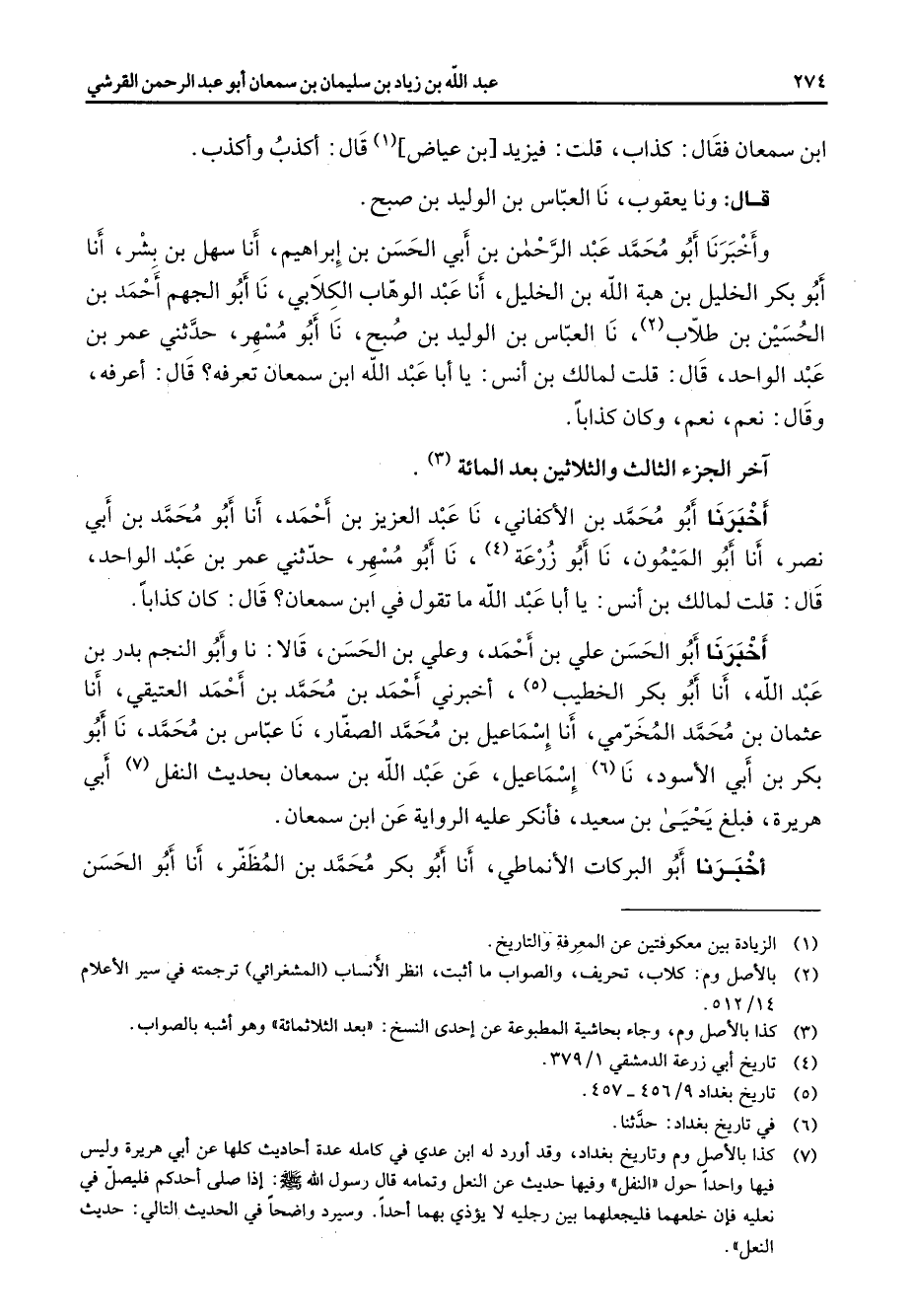 ابن سمعان فقال كذاب قلت فيزيد بن عياض (1) قال اكذب واكذب قال ونا يعقوب نا العباس بن الوليد بن صبح وأخبرنا أبو محمد عبد الرحمن بن أبي الحسن بن إبراهيم أنا سهل بن بشر أنا أبو بكر الخليل بن هبة الله بن الخليل أنا عبد الوهاب الكلابي نا أبو الجهم أحمد بن الحسين بن طلاب (2) نا العباس بن الوليد بن صبح نا أبو مسهر حدثني عمر بن عبد الواحد قال قلت لمالك بن انس يا أبا عبد الله ابن سمعان تعرفه قال اعرفه وقال نعم نعم وكان كذابا آخر الجزء الثالث والثلاثين بعد المائة (3) أخبرنا أبو محمد بن الاكفاني نا عبد العزيز بن أحمد أنا أبو محمد بن أبي نصر أنا أبو الميمون نا أبو زرعة (4) نا أبو مسهر حدثني عمر بن عبد الواحد قال قلت لمالك بن انس يا أبا عبد الله ما تقول في ابن سمعان قال كان كذابا أخبرنا أبو الحسن علي بن أحمد وعلي بن الحسن قالا نا وأبو النجم بدر بن عبد الله أنا أبو بكر الخطيب (5) اخبرني أحمد بن محمد بن أحمد العتيقي أنا عثمان بن محمد المخرمي أنا إسماعيل بن محمد الصفار نا عباس بن محمد نا أبو بكر بن أبي الاسود نا (6) إسماعيل عن عبد الله بن سمعان بحديث النفل (7) أبي هريرة فبلغ يحيى بن سعيد فانكر عليه الرواية عن ابن سمعان أخبرنا أبو البركات الانماطي أنا أبو بكر محمد بن المظفر أنا أبو الحسن