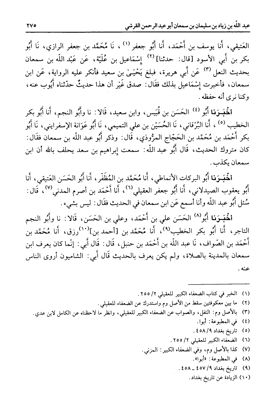 (1) الخبر في كتاب الضعفاء الكبير للعقيلي 2 / 255