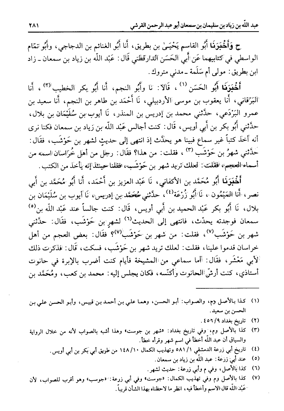 ح وأخبرنا أبو القاسم يحيى بن بطريق أنا أبو الغنائم بن الدجاجي وأبو تمام الواسطي في كتابيهما عن أبي الحسن الدارقطني قال عبد الله بن زياد بن سمعان زاد ابن بطريق مولى ام سلمة مدني متروك أخبرنا أبو الحسن (1) قالا نا وأبو النجم أنا أبو بكر الخطيب (2) أنا البرقاني أنا يعقوب بن موسى الاردبيلي نا أحمد بن طاهر بن النجم أنا سعيد بن عمرو البردعي حدثني محمد بن ادريس بن المنذر نا أيوب بن سليمان بن بلال حدثني أبو بكر بن أبي أويس قال كنت اجالس عبد الله بن زياد بن سمعان فكنا نرى انه اخذ كتبا غير سماع فبينا هو يحدث إذ انتهى إلى حديث لشهر بن حوشب فقال حدثني شهر بن حوشب (3) فقلت من هذا فقال رجل من اهل خراسان اسمه من اسماء العجم فقلت لعلك تريد شهر بن حوشب فقلنا حينئذ انه ياخذ من الكتب أخبرنا أبو محمد بن الاكفاني نا عبد العزيز بن أحمد أنا أبو محمد بن أبي نصر أنا الميمون نا أبو زرعة (4) حدثني محمد بن ادريس نا أيوب بن سليمان بن بلال نا أبو بكر عبد الحميد بن أبي اويس قال كنت جالسا عند عبد الله بن (5) سمعان فوجدته يحدث فانتهى إلى الحديث (6) لشهر بن حوشب فقال حدثني شهر بن حوشب (7) فقلت من شهر بن حوشب (7) فقال بعض العجم من اهل خراسان قدموا علينا فقلت لعلك تريد شهر بن حوشب فسكت قال فذكرت ذلك لأبي معشر فقال اما سماعي من المشيخة فايام كنت اضرب بالابرة في حانوت استاذي كنت ارش الحانوت واكنسه فكان يجلس إليه محمد بن كعب ومحمد بن