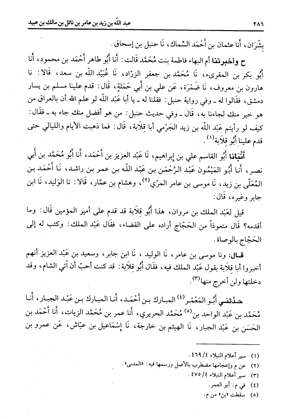 بشران أنا عثمان بن أحمد السماك نا حنبل بن إسحاق ح واخبرتنا ام البهاء فاطمة بنت محمد قالت أنا أبو طاهر أحمد بن محمود أنا أبو بكر بن المقرئ نا محمد بن جعفر الزراد نا عبيد الله بن سعد قالا نا هارون بن معروف نا ضمرة عن علي بن أبي حملة قال قدم علينا مسلم بن يسار دمشق فقالوا له وفي رواية حنبل فقلنا له يا أبا عبد الله لو علم الله ان بالعراق من هو خير منك لجاءنا به قال وفي حديث حنبل من هو افضل منك جاء به فقال كيف لو رأيتم عبد الله بن زيد الجرمي أبا قلابة قال فما ذهبت الايام والليالي حتى قدم علينا أبو قلابة (1) انبأنا أبو القاسم علي بن إبراهيم نا عبد العزيز بن أحمد أنا أبو محمد بن أبي نصر أنا أبو الميمون عبد الرحمن بن عبد الله بن عمر بن راشد نا أحمد بن المعلى بن زيد نا موسى بن عامر المري (2) وهشام بن عمار قالا نا الوليد نا ابن جابر وغيره قال قيل لعبد الملك بن مروان هذا أبو قلابة قد قدم على امير المؤمنين قال وما اقدمه قال متعوذا من الحجاج اراده على القضاء فقال عبد الملك وكتب له إلى الحجاج بالوصاة قال ونا موسى بن عامر نا الوليد نا ابن جابر وسعيد بن عبد العزيز انهم اخبروا أبا قلابة بقول عبد الملك فيه فقال أبو قلابة قد كنت احب ان آتي الشام وقد دخلتها ولن اخرج منها (3) حدثني أبو المعمر (4) المبارك بن أحمد أنا المبارك بن عبد الجبار أنا محمد بن عبد الواحد بن (5) محمد الحريري أنا عمر بن محمد بن الزيات أنا أحمد بن الحسن بن عبد الجبار نا الهيثم بن خارجة نا إسماعيل بن عياش عن عمرو بن