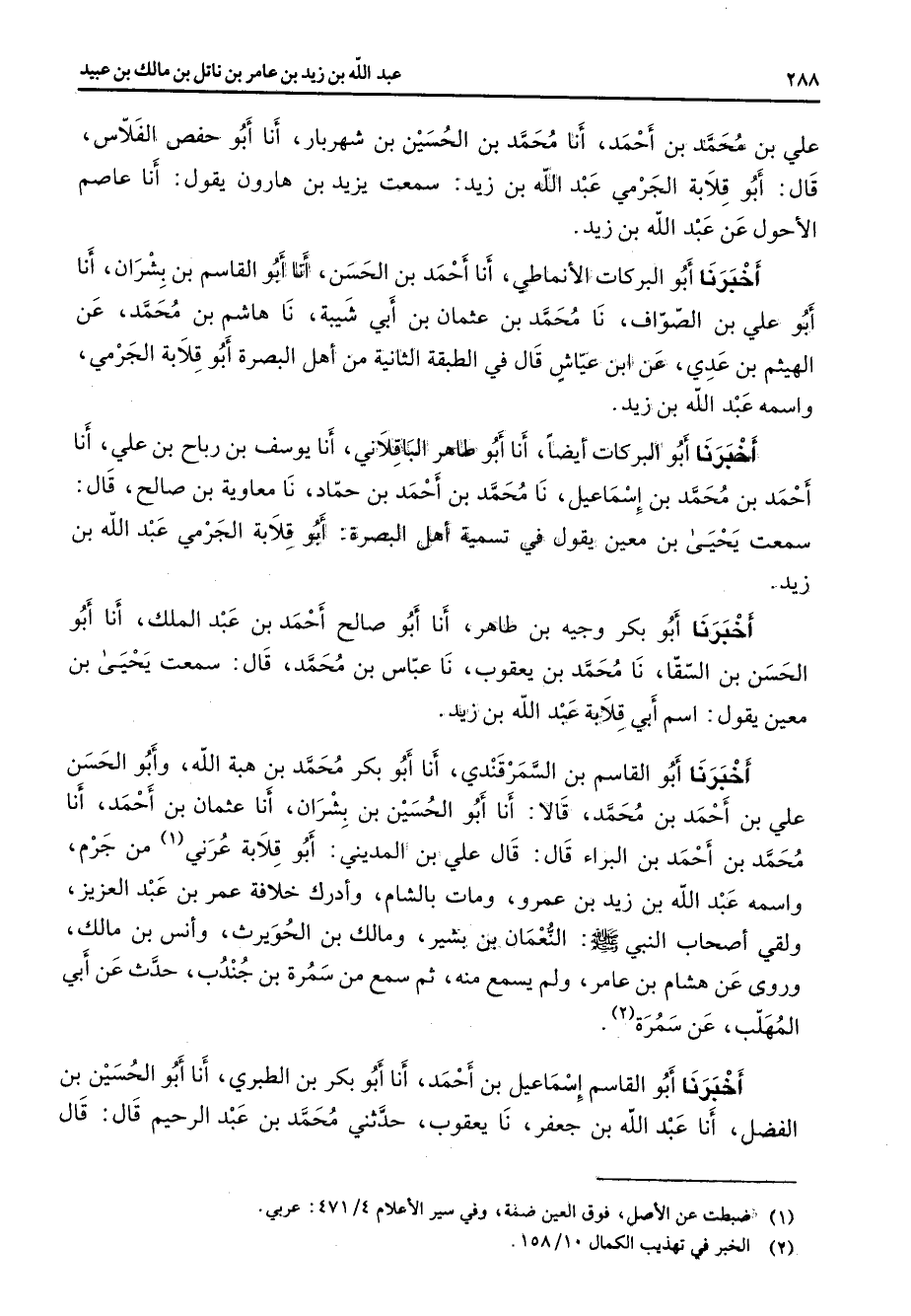 علي بن محمد بن أحمد أنا محمد بن الحسين بن شهربار أنا أبو حفص الفلاس قال أبو قلابة الجرمي عبد الله بن زيد سمعت يزيد بن هارون يقول أنا عاصم الاحول عن عبد الله بن زيد أخبرنا أبو البركات الانماطي أنا أحمد بن الحسن أنا أبو القاسم بن بشران أنا أبو علي بن الصواف نا محمد بن عثمان بن أبي شيبة نا هاشم بن محمد عن الهيثم بن عدي عن ابن عياش قال في الطبقة الثانية من اهل البصرة أبو قلابة الجرمي واسمه عبد الله بن زيد أخبرنا أبو البركات ايضا أنا أبو طاهر الباقلاني أنا يوسف بن رباح بن علي أنا أحمد بن محمد بن إسماعيل نا محمد بن أحمد بن حماد نا معاوية بن صالح قال سمعت يحيى بن معين يقول في تسمية اهل البصرة أبو قلابة الجرمي عبد الله بن زيد أخبرنا أبو بكر وجيه بن طاهر أنا أبو صالح أحمد بن عبد الملك أنا أبو الحسن بن السقا نا محمد بن يعقوب نا عباس بن محمد قال سمعت يحيى بن معين يقول اسم أبي قلابة عبد الله بن زيد أخبرنا أبو القاسم بن السمرقندي أنا أبو بكر محمد بن هبة الله وأبو الحسن علي بن أحمد بن محمد قالا أنا أبو الحسين بن بشران أنا عثمان بن أحمد أنا محمد بن أحمد بن البراء قال قال علي بن المديني أبو قلابة عرني (1) من جرم واسمه عبد الله بن زيد بن عمرو ومات بالشام وادرك خلافة عمر بن عبد العزيز ولقي اصحاب النبي (صلى الله عليه وسلم) النعمان بن بشير ومالك بن الحويرث وانس بن مالك وروى عن هشام بن عامر ولم يسمع منه ثم سمع من سمرة بن جندب حدث عن أبي المهلب عن سمرة (2) أخبرنا أبو القاسم إسماعيل بن أحمد أنا أبو بكر بن الطبري أنا أبو الحسين بن الفضل أنا عبد الله بن جعفر نا يعقوب حدثني محمد بن عبد الرحيم قال قال