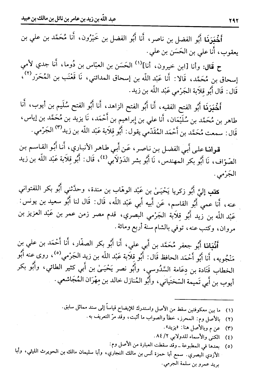 أخبرنا أبو الفضل بن ناصر أنا أبو الفضل بن خيرون أنا محمد بن علي بن يعقوب أنا علي بن الحسن بن علي ح قال وأنا ابن خيرون أنا (1) الحسن بن العباس بن دوما أنا جدي لامي إسحاق بن محمد قالا أنا عبد الله بن إسحاق المدائني نا قعنب بن المحرر (2) قال قال أبو قلابة الجرمي عبد الله بن زيد أخبرنا أبو الفتح الفقيه أنا أبو الفتح الزاهد أنا أبو الفتح سليم بن أيوب أنا طاهر بن محمد بن سليمان أنا علي بن إبراهيم بن أحمد نا يزيد بن محمد بن اياس قال سمعت محمد بن أحمد المقدمي يقول أبو قلابة عبد الله بن زيد (3) الجرمي قرأنا على أبي الفضل بن ناصر عن أبي طاهر الانباري أنا أبو القاسم بن الصواف نا أبو بكر المهندس نا أبو بشر الدولابي (4) قال أبو قلابة عبد الله بن زيد الجرمي كتب الي أبو زكريا بن عبد الوهاب بن مندة وحدثني أبو بكر اللفتواني عنه أنا عمي أبو القاسم عن أبيه أبي عبد الله قال قال لنا أبو سعيد بن يونس عبد الله بن زيد أبو قلابة الجرمي البصري قدم مصر زمن عمر بن عبد العزيز بن مروان وكتب عنه توفي بالشام سنة اربع ومائة انبأنا أبو جعفر محمد بن أبي علي أنا أبو بكر الصفار أنا أحمد بن علي بن منجوية أنا أبو أحمد الحافظ قال أبو قلابة عبد الله بن زيد الجرمي (5) روى عنه أبو الخطاب قتادة بن دعامة السدوسي وأبو نصر يحيى بن أبي كثير الطائي وأبو بكر أيوب بن أبي تميمة السختياني وأبو المنازل خالد بن مهران المجاشعي