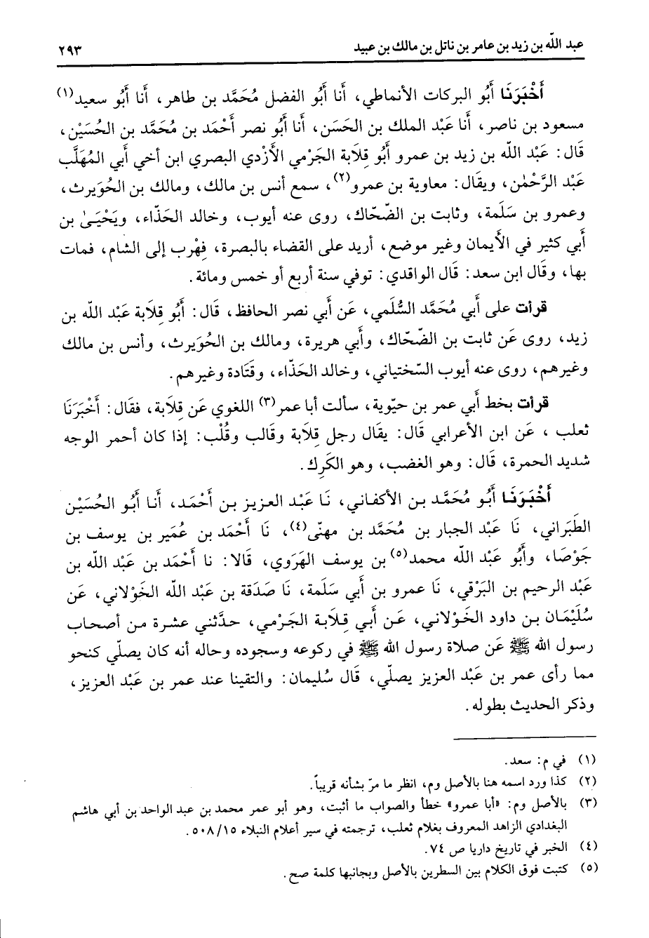 أخبرنا أبو البركات الانماطي أنا أبو الفضل محمد بن طاهر أنا أبو سعيد (1) مسعود بن ناصر أنا عبد الملك بن الحسن أنا أبو نصر أحمد بن محمد بن الحسين قال عبد الله بن زيد بن عمرو أبو قلابة الجرمي الازدي البصري ابن اخي أبي المهلب عبد الرحمن ويقال معاوية بن عمرو (2) سمع انس بن مالك ومالك بن الحويرث وعمرو بن سلمة وثابت بن الضحاك روى عنه أيوب وخالد الحذاء ويحيى بن أبي كثير في الايمان وغير موضع اريد على القضاء بالبصرة فهرب إلى الشام فمات بها وقال ابن سعد قال الواقدي توفي سنة اربع أو خمس ومائة قرأت على أبي محمد السلمي عن أبي نصر الحافظ قال أبو قلابة عبد الله بن زيد روى عن ثابت بن الضحاك وأبي هريرة ومالك بن الحويرث وانس بن مالك وغيرهم روى عنه أيوب السختياني وخالد الحذاء وقتادة وغيرهم قرأت بخط أبي عمر بن حيوية سألت أبا عمر (3) اللغوي عن قلابة فقال أخبرنا ثعلب عن ابن الاعرابي قال يقال رجل قلابة وقالب وقلب إذا كان احمر الوجه شديد الحمرة قال وهو الغضب وهو الكرك أخبرنا أبو محمد بن الاكفاني نا عبد العزيز بن أحمد أنا أبو الحسين الطبراني نا عبد الجبار بن محمد بن مهنى (4) نا أحمد بن عمير بن يوسف بن جوصا وأبو عبد الله محمد (5) بن يوسف الهروي قالا نا أحمد بن عبد الله بن عبد الرحيم بن البرقي نا عمرو بن أبي سلمة نا صدقة بن عبد الله الخولاني عن سليمان بن داود الخولاني عن أبي قلابة الجرمي حدثني عشرة من اصحاب رسول الله (صلى الله عليه وسلم) عن صلاة رسول الله (صلى الله عليه وسلم) في ركوعه وسجوده وحاله انه كان يصلي كنحو مما راى عمر بن عبد العزيز يصلي قال سليمان والتقينا عند عمر بن عبد العزيز وذكر الحديث بطوله