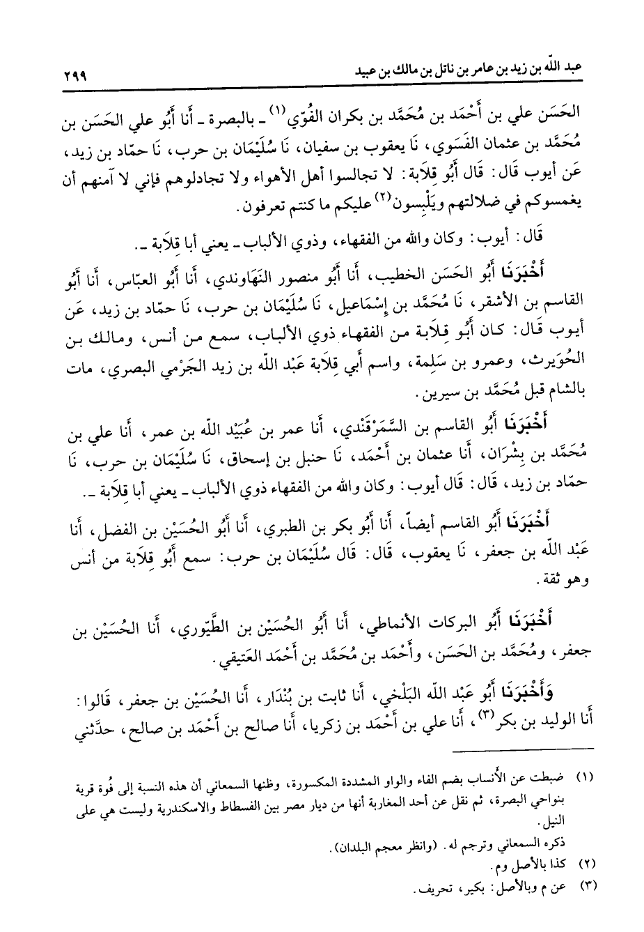 الحسن علي بن أحمد بن محمد بن بكران الفوي (1) بالبصرة أنا أبو علي الحسن بن محمد بن عثمان الفسوي نا يعقوب بن سفيان نا سليمان بن حرب نا حماد بن زيد عن أيوب قال قال أبو قلابة لا تجالسوا اهل الاهواء ولاتجادلوهم فاني لا آمنهم ان يغمسوكم في ضلالتهم ويلبسون (2) عليكم ما كنتم تعرفون قال أيوب وكان والله من الفقهاء وذوي الالباب يعني أبا قلابة أخبرنا أبو الحسن الخطيب أنا أبو منصور النهاوندي أنا أبو العباس أنا أبو القاسم بن الاشقر نا محمد بن إسماعيل نا سليمان بن حرب نا حماد بن زيد عن أيوب قال كان أبو قلابة من الفقهاء ذوي الالباب سمع من انس ومالك بن الحويرث وعمرو بن سلمة واسم أبي قلابة عبد الله بن زيد الجرمي البصري مات بالشام قبل محمد بن سيرين أخبرنا أبو القاسم بن السمرقندي أنا عمر بن عبيد الله بن عمر أنا علي بن محمد بن بشران أنا عثمان بن أحمد نا حنبل بن إسحاق نا سليمان بن حرب نا حماد بن زيد قال قال أيوب وكان والله من الفقهاء ذوي الالباب يعني أبا قلابة أخبرنا أبو القاس ايضا أنا أبو بكر بن الطبري أنا أبو الحسين بن الفضل أنا عبد الله بن جعفر نا يعقوب قال قال سليمان بن حرب سمع أبو قلابة من انس وهو ثقة أخبرنا أبو البركات الانماطي أنا أبو الحسين بن الطيوري أنا الحسين بن جعفر ومحمد بن الحسن وأحمد بن محمد بن أحمد العتيقي وأخبرنا أبو عبد الله والبلخي أنا ثابت بن بندار أنا الحسين بن جعفر قالوا أنا الوليد بن بكر أنا علي بن أحمد بن زكريا أنا صالح بن أحمد بن صالح حدثني