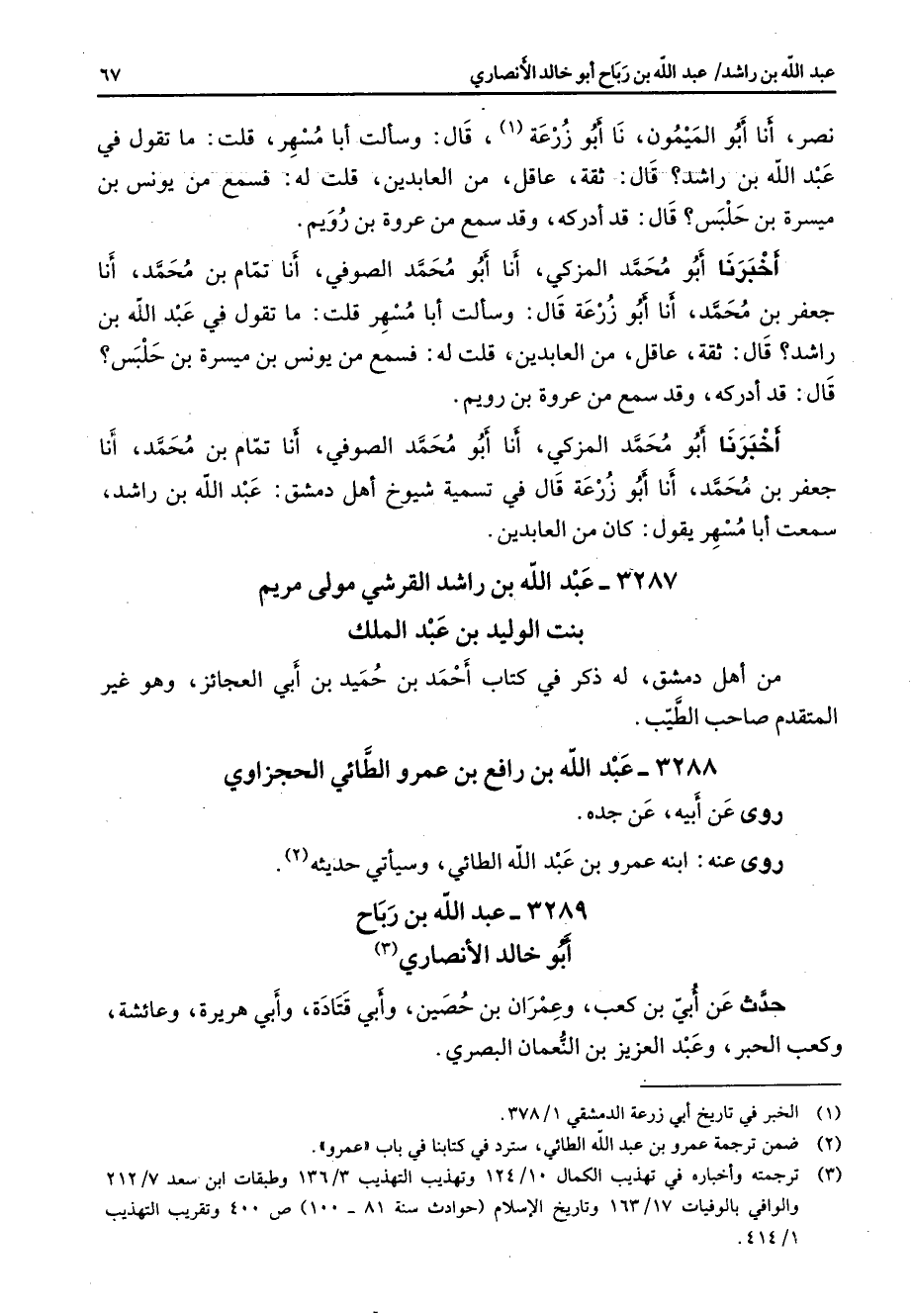 نصر أنا أبو الميمون نا أبو زرعة (1) قال وسألت أبا مسهر قلت ما تقول في عبد الله بن راشد قال ثقة عاقل من العابدين قلت له فسمع من يونس بن ميسرة بن حلبس قال قد أدركه وقد سمع من عروة بن رويم أخبرنا أبو محمد المزكي أنا أبو محمد الصوفي أنا تمام بن محمد أنا جعفر بن محمد أنا أبو زرعة قال وسألت أبا مسهر قلت ما تقول في عبد الله بن راشد قال ثقة عاقل من العابدين قلت له فسمع من يونس بن ميسرة بن حلبس؟ قال قد أدركه وقد سمع من عروة بن ريم أخبرنا أبو محمد المزكي أنا أبو محمد الصوفي أنا تمام بن محمد أنا جعفر بن محمد أنا أبو زرعة قال في تسمية شيوخ أهل دمشق عبد الله بن راشد سمعت أبا مسهر يقول كان من العابدين