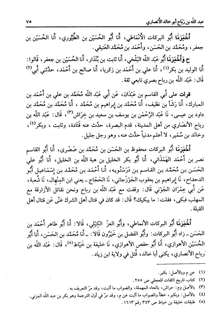 أخبرنا أبو البركات الأنماطي أنا أبو الحسين بن الطيوري أنا الحسين بن جعفر ومحمد بن الحسن وأحمد بن محمد العتيقي ح وأخبرنا أبو عبد الله البلخي أنا ثابت بن بندار أنا الحسين بن جعفر قالوا أنا الوليد بن بكر (1) أنا علي بن أحمد بن زكريا أنا صالح بن أحمد حدثني أبي (2) قال عبد الله بن رباح بصري تابعي ثقة قرأت على أبي القاسم بن عبدان عن أبي عبد الله محمد بن علي بن أحمد بن المبارك أنا رشأ بن نظيف أنا محمد بن إبراهيم بن محمد أنا محمد بن محمد بن داود بن عيسى نا عبد الرحمن بن يوسف بن سعيد بن خراش (3) قال عبد الله بن رباح الأنصاري من أهل المدينة قدم البصرة حدث عنه قتادة وثابت وبكر (4) وخالد بن سمير لا أعلم مدنيا حدث عنه وهو رجل جليل أخبرنا أبو البركات محفوظ بن الحسن بن محمد بن صصرى أنا أبو القاسم نصر بن أحمد الهمذاني أنا أبو بكر الخليل بن هبة الله بن الخليل أنا أبو علي الحسن بن محمد بن القاسم بن درستويه أنا أحمد بن محمد بن إسماعيل أبو الدحداح نا إبراهيم بن يعقوب الجوزجاني نا الحجاج يعني ابن المنهال نا شعبة عن أبي عمران الجوني قال وقفت مع عبد الله بن رباح ونحن نقاتل الأزارقة مع المهلب فبكى فقلت ما يبكيك قال قد كان في قتال أهل الشرك غني عن قتال أهل القبلة أخبرنا أبو البركات الأنماطي وأبو العز الكيلي قالا أنا أبو طاهر أحمد بن الحسن زاد أبو البركات وأبو الفضل بن خيرون قالا أنا محمد بن الحسن أنا أبو الحسين الأهوازي أنا أبو حفص الأهوازي نا خليفة بن خياط (5) قال عبد الله بن رباح الأنصاري يكني أبا خالد قتل في ولاية ابن زياد