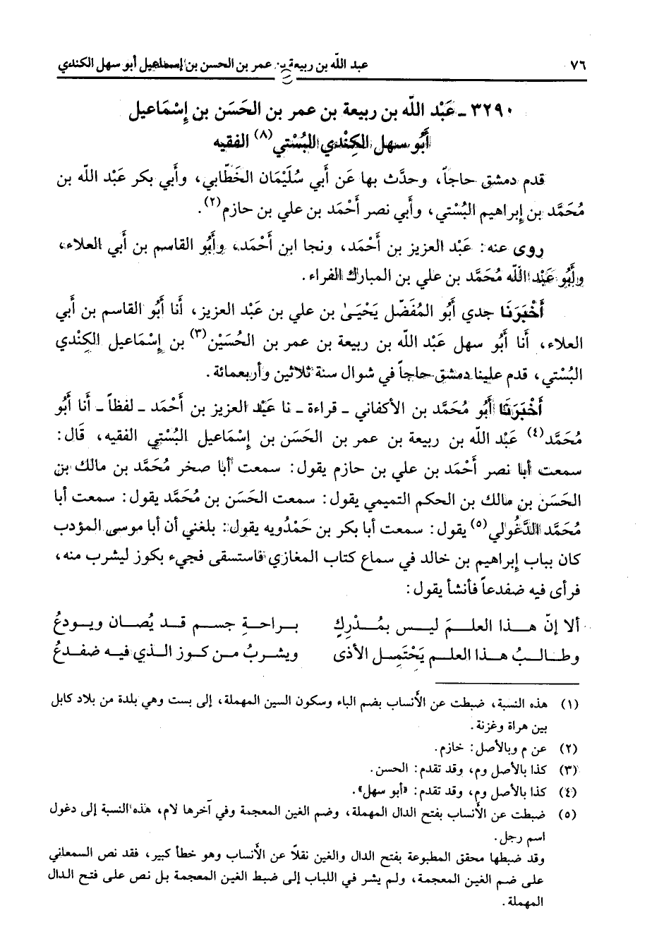 3290 - عبد الله بن ربيعة بن عمر بن الحسن بن إسماعيل أبو سهل الكندي البستي (8) الفقيه قدم دمشق حاجا وحدث بها عن أبي سليمان الخطابي وأبي بكر عبد الله بن محمد بن إبراهيم البستي وأبي نصر أحمد بن علي بن حازم (2) روى عنه عبد العزيز بن أحمد ونجا ابن أحمد وأبو القاسم بن أبي العلاء وأبو عبد الله محمد بن علي بن المبارك الفراء أخبرنا جدي أبو المفضل يحيى بن علي بن عبد العزيز أنا أبو القاسم بن أبي العلاء أنا أبو سهل عبد الله بن ربيعة بن عمر بن الحسين (3) بن إسماعيل الكندي البستي قدم علينا دمشق حاجا في شوال سنة ثلاثين وأربعمائة أخبرنا أبو محمد بن الأكفاني قرأة نا عبد العزيز بن أحمد لفظا أنا أبو محمد (4) عبد الله بن ربيعة بن عمر بن الحسن بن إسماعيل البستي الفقيه قال سمعت أبا نصر أحمد بن علي بن حازم يقول سمعت أبا صخر محمد بن مالك بن الحسن بن مالك بن الحكم التميمي يقول سمعت الحسن بن محمد يقول سمعت أبا محمد الدغولي (5) يقول سمعت أبا بكر بن حمدويه يقول بلغني أن أبا موسى المؤدب كان بباب إبراهيم بن خالد في سماع كتاب المغازي فاستسقى فجئ بكوز ليشرب منه فرأى فيه ضفدعا فأنشأ يقول * ألا إن هذا العلم ليس بمدرك * براحة جسم قد يصان ويودع وطالب هذا العلم يحتمل الأذى * ويشرب من كوز الذي فيه ضفدع *