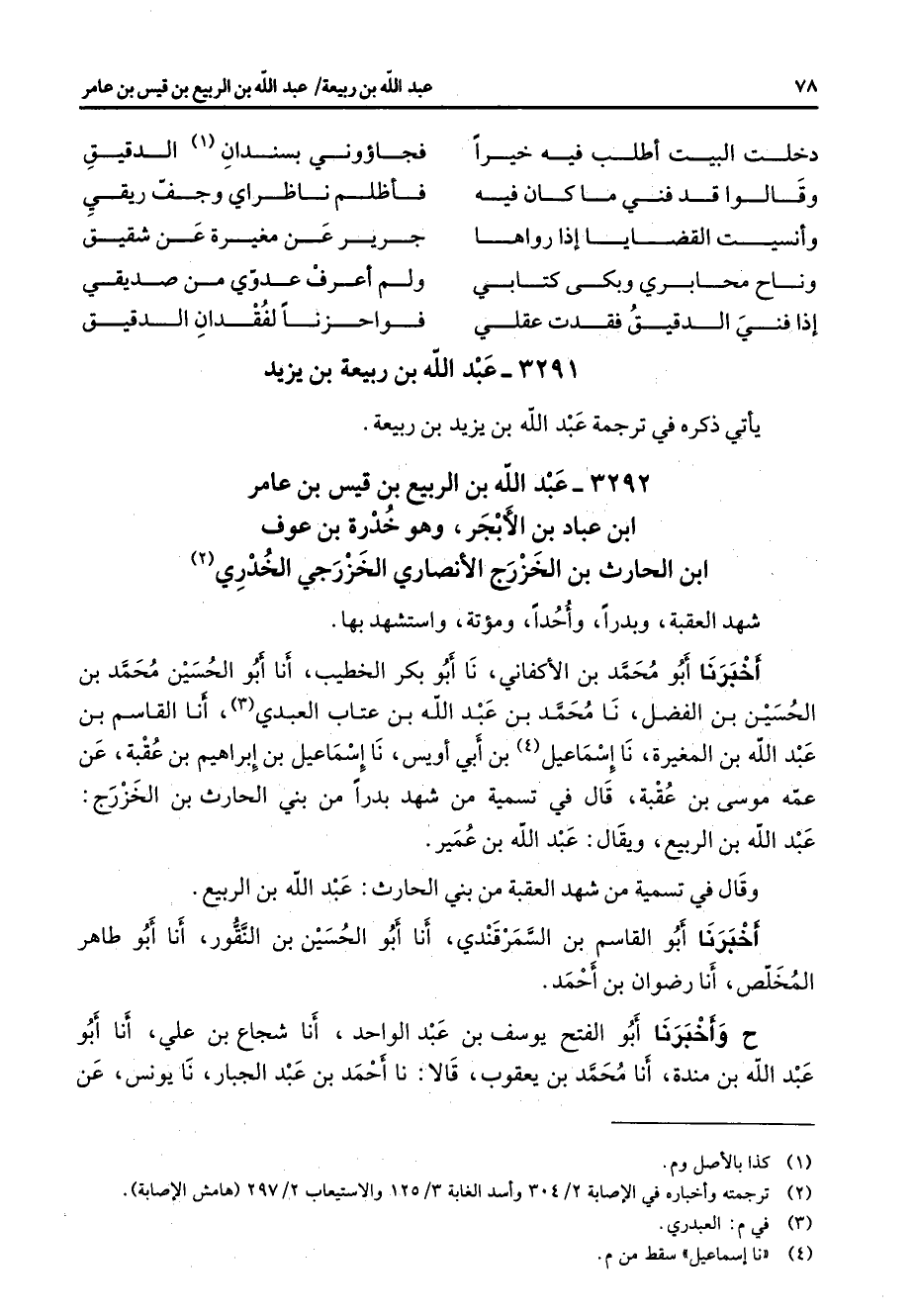 3292 - عبد الله بن الربيع بن قيس بن عامر ابن عباد بن الأبجر وهو خدرة بن عوف ابن الحارث بن الخزرج الأنصاري الخزرجي الخدري (2) شهد العقبة وبدرا وأحدا ومؤتة واستشهد بها أخبرنا أبو محمد بن الأكفاني نا أبو بكر الخطيب أنا أبو الحسين محمد بن الحسين بن الفضل نا محمد بن عبد الله بن عتاب العبدي (3) أنا القاسم بن عبد الله بن المغيرة نا إسماعيل (4) بن أبي أويس نا إسماعيل بن إبراهيم بن عقبة عن عمه موسى بن عقبة قال في تسمية من شهد بدرا من بني الحارث بن الخزرج عبد الله بن الربيع ويقال عبد الله بن عمير وقال في تسمية من شهد العقبة من بني الحارث عبد الله بن الربيع أخبرنا أبو القاسم بن السمرقندي أنا أبو الحسين بن النقور أنا أبو طاهر المخلص أنا رضوان بن أحمد ح وأخبرنا أبو الفتح يوسف بن عبد الواحد أنا شجاع بن علي أنا أبو عبد الله بن مندة أنا محمد بن يعقوب قالا نا أحمد بن عبد الجبار نا يونس عن