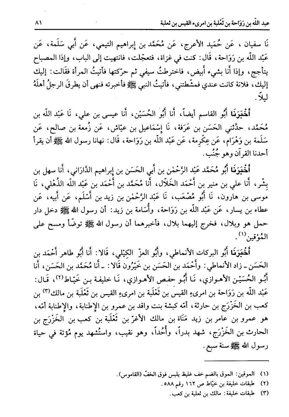 نا سفيان عن حميد الأعرج عن محمد بن إبراهيم التيمي عن أبي سلمة عن عبد الله بن رواحة قال كنت في غزاة فتعجلت فانتهيت إلى الباب وإذا المصباح يتأجج وإذا أنا بشئ أبيض فاخترطت سيفي ثم حركتها فأتيت المرأة فقالت إليك إليك فلانة كانت عندي فمشطتني فأتيت النبي (صلى الله عليه وسلم) فأخبرته فنهى أن يطرق الرجل أهله ليلا أخبرنا أبو القاسم أيضا أنا أبو الحسين أنا عيسى بن علي نا عبد الله بن محمد حدثني الحسن بن عرفة نا إسماعيل بن عياش عن زمعة بن صالح عن سلمة بن وهرام عن عكرمة عن عبد الله بن رواحة قال نهانا رسول الله (صلى الله عليه وسلم) أن يقرأ أحدنا القرآن وهو جنب أخبرنا أبو محمد عبد الرحمن بن أبي الحسن بن إبراهيم الداراني أنا سهل بن بشر أنا علي بن منير بن أحمد الخلال أنا محمد بن أحمد بن عبد الله الذهلي نا موسى بن هارون نا أبو مصعب نا عبد الرحمن بن زيد بن أسلم عن أبيه عن عطاء بن يسار عن عبد الله بن رواحة وأسامة بن زيد أن رسول الله (صلى الله عليه وسلم) دخل دار حمل هو وبلال فخرج إليهما بلال فأخبرهما أن رسول الله (صلى الله عليه وسلم) توضأ ومسح على الموقين (1) أخبرنا أبو البركات الأنماطي وأبو العز الكيلي قالا أنا أبو طاهر أحمد بن الحسن زاد الأنماطي وأحمد بن الحسن بن خيرون قالا أنا محمد بن الحسن أنا أبو الحسين الأهوازي نا أبو حفص الأهوازي نا خليفة بن خياط (2) قال عبد الله بن رواحة بن امرئ القيس بن ثعلبة بن امرئ القيس بن ثعلبة بن مالك (3) بن كعب بن الخزرج بن حارثة أمه كبشة بنت واقد بن عمرو بن الإطنابة والإطنابة أمه هو عمرو بن عامر بن زيد مناة بن مالك الأغر بن ثعلبة بن كعب بن الخزرج بن الحارث بن الخزرج شهد بدرا وأحدا وهو نقيب واستشهد يوم مؤتة في حياة رسول الله (صلى الله عليه وسلم) سنة سبع