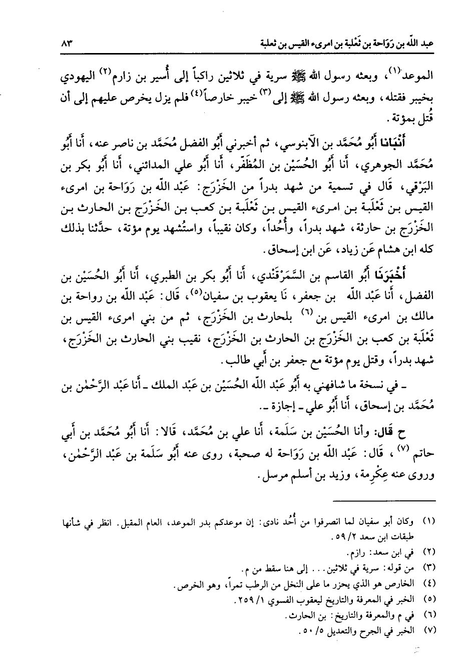 الموعد (1) وبعثه رسول الله (صلى الله عليه وسلم) سرية في ثلاثين راكبا إلى أسير بن زارم (2) اليهودي بخيبر فقتله وبعثه رسول الله (صلى الله عليه وسلم) إلى (3) خيبر خارصا (4) فلم يزل يخرص عليهم إلى أن قتل بمؤتة أنبأنا أبو محمد بن الآبنوسي ثم أخبرني أبو الفضل محمد بن ناصر عنه أنا أبو محمد الجوهري أنا أبو الحسين بن المظفر أنا أبو علي المدائني أنا أبو بكر بن البرقي قال في تسمية من شهد بدرا من الخزرج عبد الله بن رواحة بن امرئ القيس بن ثعلبة بن امرئ القيس بن ثعلبة بن كعب بن الخزرج بن الحارث بن الخزرج بن حارثة شهد بدرا وأحدا وكان نقيبا واستشهد يوم مؤتة حدثنا بذلك كله ابن هشام عن زياد عن ابن إسحاق أخبرنا أبو القاسم بن السمرقندي أنا أبو بكر بن الطبري أنا أبو الحسين بن الفضل أنا عبد الله بن جعفر نا يعقوب بن سفيان (5) قال عبد الله بن رواحة بن مالك بن امرئ القيس بن (6) الحارث بن الخزرج ثم من بني امرئ القيس بن ثعلبة بن كعب بن الخزرج بن الحارث بن الخزرج نقيب بني الحارث بن الخزرج شهد بدرا وقتل يوم مؤتة مع جعفر بن أبي طالب في نسخة ما شافهني به أبو عبد الله الحسين بن عبد الملك أنا عبد الرحمن محمد بن إسحاق أنا أبو علي إجازة ح قال وأنا الحسين بن سلمة أنا علي بن محمد قالا أنا أبو محمد بن أبي حاتم (7) قال عبد الله بن رواحة له صحبة روى عنه أبو سلمة بن عبد الرحمن وروى عنه عكرمة وزيد بن أسلم مرسل