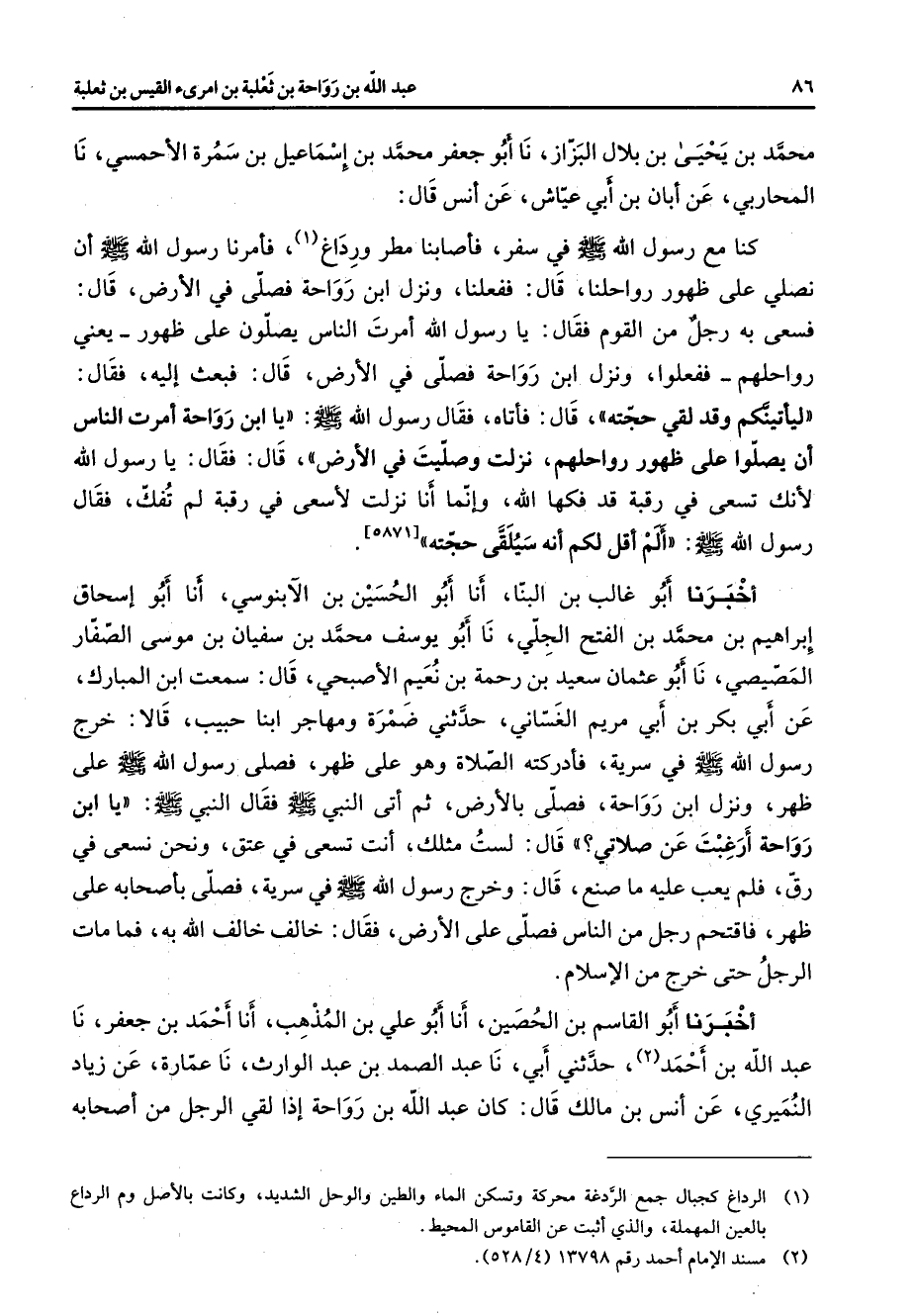 محمد بن يحيى بن بلال البزاز نا أبو جعفر محمد بن إسماعيل بن سمرة الأحمسي نا المحاربي عن أبان بن أبي عياش عن أنس قال كنا مع رسول الله (صلى الله عليه وسلم) في سفر فأصابنا مطر ورداغ (1) فأمرنا رسول الله (صلى الله عليه وسلم) أن نصلي على ظهور رواحلنا قال ففعلنا ونزل ابن رواحة فصلى في الأرض قال فسعى به رجل من القوم فقال يا رسول الله أمرت الناس يصلون على ظهور يعني رواحلهم ففعلوا ونزل ابن رواحة فصلى في الأرض قال فبعث إليه فقال ليأتينكم وقد لقي حجته قال فأتاه فقال رسول الله (صلى الله عليه وسلم) يا ابن رواحة أمرت الناس أن يصلوا على ظهور رواحلهم نزلت وصليت في الأرض قال فقال يا رسول الله لأنك تسعى في رقبة قد فكها الله وإنما أنا نزلت لأسعى في رقبة لم تفك فقال رسول الله (صلى الله عليه وسلم) ألم أقل لكم أنه سيلقى حجته أخبرنا أبو غالب بن البنا أنا أبو الحسين بن الآبنوسي أنا أبو إسحاق إبراهيم بن محمد بن الفتح الجلي نا أبو يوسف محمد بن سفيان بن موسى الصفار المصيصي نا أبو عثمان سعيد بن رحمة بن نعيم الأصبحي قال سمعت ابن المبارك عن أبي بكر بن أبي مريم الغساني حدثني ضمرة ومهاجر ابنا حبيب قالا خرج رسول الله (صلى الله عليه وسلم) في سرية فأدركته الصلاة وهو على ظهر فصلى رسول الله على ظهر ونزل ابن رواحة فصلى بالأرض ثم أتى النبي (صلى الله عليه وسلم) فقال النبي (صلى الله عليه وسلم) يا ابن رواحة أرغبت عن صلاتي قال لست مثلك أنت تسعى في عتق ونحن نسعى في رق فلم يعب عليه ما صنع قال وخرج رسول الله (صلى الله عليه وسلم) في سرية فصلى بأصحابه على ظهر فاقتحم رجل من الناس فصلى على الأرض فقال خالف خالف الله به فما مات الرجل حتى خرج من الإسلام أخبرنا أبو القاسم بن الحصين أنا أبو علي بن المذهب أنا أحمد بن جعفر نا عبد الله بن أحمد (2) حدثني أبي نا عبد الصمد بن عبد الوارث نا عمارة عن زياد النميري عن أنس بن مالك قال كان عبد الله بن رواحة إذا لقي الرجل من أصحابه