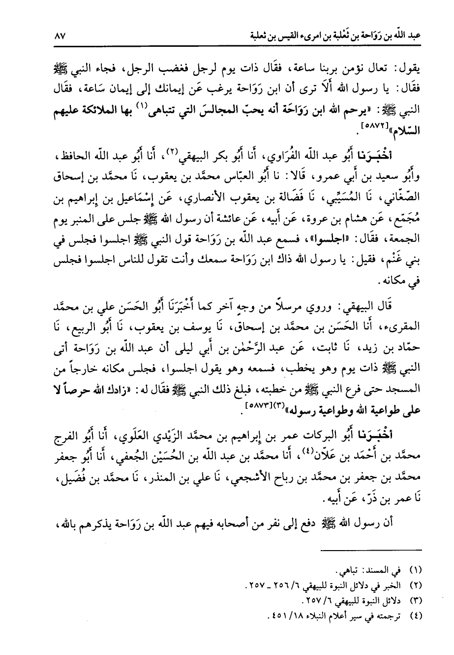 يقول تعال نؤمن بربنا ساعة فقال ذات يوم لرجل فغضب الرجل فجاء النبي (صلى الله عليه وسلم) فقال يا رسول الله ألا ترى أن ابن رواحة يرغب عن إيمانك إلى إيمان ساعة فقال النبي (صلى الله عليه وسلم) يرحم الله ابن رواحة أنه يحب المجالس التي تتباهى (1) بها الملائكة عليهم السلام أخبرنا أبو عبد الله الفراوي أنا أبو بكر البيهقي (2) أنا أبو عبد الله الحافظ وأبو سعيد بن أبي عمرو قالا نا أبو العباس محمد بن يعقوب نا محمد بن إسحاق الصغاني نا المسيبي نا فضالة بن يعقوب الأنصاري عن إسماعيل بن إبراهيم بن مجمع عن هشام بن عروة عن أبيه عن عائشة أن رسول الله (صلى الله عليه وسلم) جلس على المنبر يوم الجمعة فقال اجلسوا فسمع عبد الله بن رواحة قول النبي (صلى الله عليه وسلم) اجلسوا فجلس بفي بني غنم فقيل يا رسول الله ذاك ابن رواحة سمعك وأنت تقول للناس اجلسوا فجلس في مكانه قال البيهقي وروي مرسلا من وجه آخر كما أخبرنا أبو الحسن علي بن محمد المقرئ أنا الحسن بن محمد بن إسحاق نا يوسف بن يعقوب نا أبو الربيع نا حماد بن زيد نا ثابت عن عبد الرحمن بن أبي ليلى أن عبد الله بن رواحة أتى النبي (صلى الله عليه وسلم) ذات يوم وهو يخطب فسمعه وهو يقول اجلسوا فجلس مكانه خارجا من المسجد حتى فرغ النبي (صلى الله عليه وسلم) من خطبته فبلغ ذلك النبي (صلى الله عليه وسلم) فقال له زادك الله حرصا لا على طواعية الله وطواعية رسوله أخبرنا أبو البركات عمر بن إبراهيم بن محمد الزيدي العلوي أنا أبو الفرج محمد بن أحمد بن علان (4) أنا محمد بن عبد الله بن الحسين الجعفي أنا أبو جعفر محمد بن جعفر بن محمد بن رباح الأشجعي نا علي بن المنذر نا محمد بن فضيل نا عمر بن ذر عن أبيه أن رسول الله (صلى الله عليه وسلم) دفع إلى نفر من أصحابه فيهم عبد الله بن رواحة يذكرهم بالله