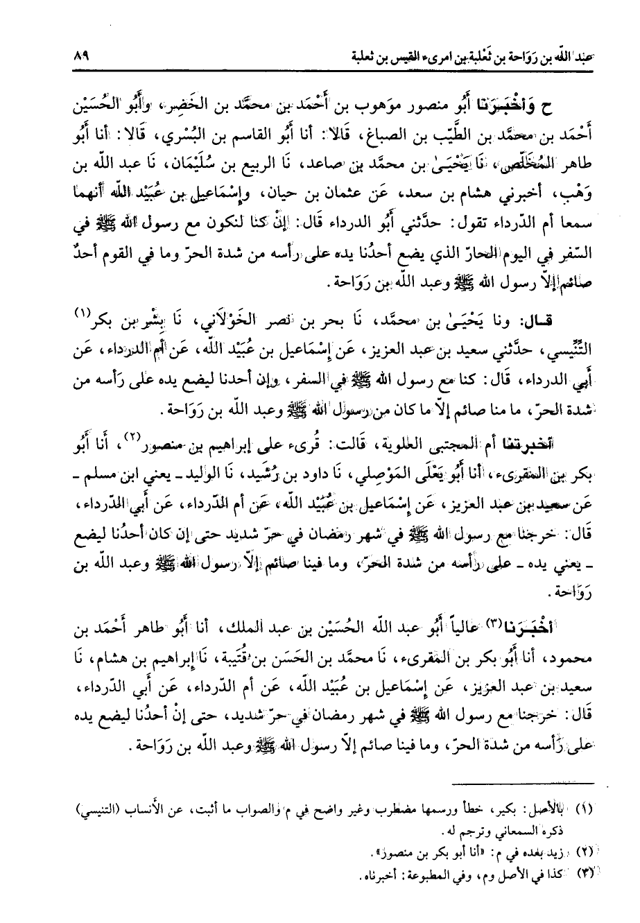 ح وأخبرنا أبو منصور موهوب بن أحمد بن محمد بن الخضر وأبو الحسين أحمد بن محمد بن الطيب بن الصباغ قالا أنا أبو القاسم بن البسري قالا أنا أبو طاهر المخلص نا يحيى بن محمد بن صاعد نا الربيع بن سليمان نا عبد الله بن وهب أخبرني هشام بن سعد عن عثمان بن حيان وإسماعيل بن عبيد الله أنهما سمعا أم الدرداء تقول حدثني أبو الدرداء قال إن كنا لنكون مع رسول الله (صلى الله عليه وسلم) في السفر في اليوم الحار الذي يضع أحدنا يده على رأسه من شدة الحر وما في القوم أحد صائم إلا رسول الله (صلى الله عليه وسلم) وعبد الله بن رواحة قال ونا يحيى بن محمد نا بحر بن نصر الخولاني نا بشر بن بكر (1) التنيسي حدثني سعيد بن عبد العزيز عن إسماعيل بن عبيد الله عن أم الدرداء عن أبي الدرداء قال كنا مع رسول الله (صلى الله عليه وسلم) في السفر وإن أحدنا ليضع يده على رأسه من شدة الحر ما منا صائم إلا ما كان من رسول الله (صلى الله عليه وسلم) وعبد الله بن رواحة أخبرتنا أم المجتبي العلوية قالت قرئ على إبراهيم بن منصور (2) أنا أبو بكر بن المقرئ أنا أبو يعلى الموصلي نا داود بن رشيد نا الوليد يعني ابن مسلم عن سعيد بن عبد العزيز عن إسماعيل بن عبيد الله عن أم الدرداء عن أبي الدرداء قال خرجنا مع رسول الله (صلى الله عليه وسلم) في شهر رمضان في حر شديد حتى إن كان أحدنا ليضع يعني يده على رأسه من شدة الحر وما فينا صائم إلا رسول الله (صلى الله عليه وسلم) وعبد الله بن رواحة أخبرنا (3) عاليا أبو عبد الله الحسين بن عبد الملك أنا أبو طاهر أحمد بن محمود أنا أبو بكر بن المقرئ نا محمد بن الحسن بن قتيبة نا إبراهيم بن هشام نا سعيد بن عبد العزيز عن إسماعيل بن عبيد الله عن أم الدرداء عن أبي الدرداء قال خرجنا مع رسول الله (صلى الله عليه وسلم) في شهر رمضان في حر شديد حتى إن أحدنا ليضع يده على رأسه من شدة الحر وما فينا صائم إلا رسول الله (صلى الله عليه وسلم) وعبد الله بن رواحة