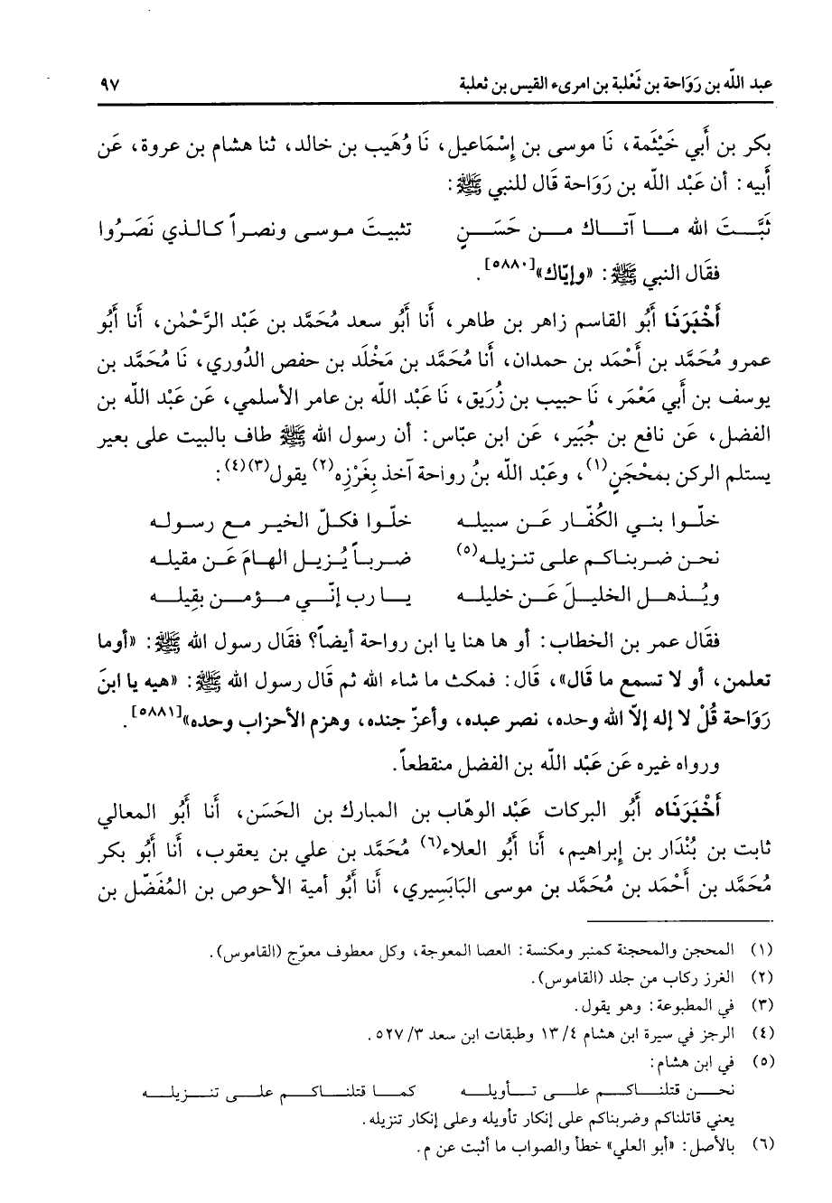 بكر بن أبي خيثمة نا موسى بن إسماعيل نا وهيب بن خالد ثنا هشام بن عروة عن أبيه أن عبد الله بن رواحة قال للنبي (صلى الله عليه وسلم) * ثبت الله ما أتاك من حسن * تثبيت موسى ونصرا كالذي نصروا * فقال النبي (صلى الله عليه وسلم) وإياك أخبرنا أبو القاسم زاهر بن طاهر أنا أبو سعد محمد بن عبد الرحمن أنا أبو عمرو محمد بن أحمد بن حمدان أنا محمد بن مخلد بن حفص الدوري نا محمد بن يوسف بن أبي معمر نا حبيب بن زريق نا عبد الله بن عامر الأسلمي عن عبد الله بن الفضل عن نافع بن جبير عن ابن عباس أن رسول الله (صلى الله عليه وسلم) طاف بالبيت على بعير يستلم الركن بمحجن (1) وعبد الله بن رواحة آخذ بغرزه (2) يقول (3) (4) * خلوا بني الكفار عن سبيله * خلوا فكل الخير مع رسوله نحن ضربناكم على تنزيله (5) * ضربا يزيل الهام عن مقيله ويذهل الخليل عن خليله * يا رب إني مؤمن بقيله * فقال عمر بن الخطاب أو ها هنا يا ابن رواحة أيضا فقال رسول الله (صلى الله عليه وسلم) أوما تعلمن أو لا تسمع ما قال قال فمكث ما شاء الله ثم قال رسول الله (صلى الله عليه وسلم) هيه يا ابن رواحة قل لا إله إلا الله وحده نصر عبده وأعز جنده وهزم الأحزاب وحده ورواه غيره عن عبد الله بن الفضل منقطعا أخبرناه أبو البركات عبد الوهاب بن المبارك بن الحسن أنا أبو المعالي ثابت بن بندار بن إبراهيم أنا أبو العلاء (6) محمد بن علي بن يعقوب أنا أبو بكر محمد بن أحمد بن محمد بن موسى البابسيري أنا أبو أمية الأحوص بن المفضل بن
