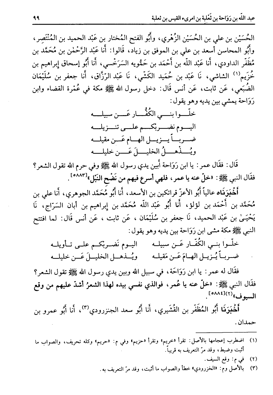 الحسين بن علي بن الحسين الزهري وأبو الفتح المختار بن عبد الحميد بن المنتصر وأبو المحاسن اسعد بن علي بن الموفق بن زياد قالوا أنا عبد الرحمن بن محمد بن مظفر الداودي أنا عبد الله بن أحمد بن حموية السرخسي أنا أبو إسحاق إبراهيم بن خزيم (1) الشاشي نا عبد بن حميد الكشي نا عبد الرزاق أنا جعفر بن سليمان الضبعي عن ثابت عن انس قال دخل رسول الله (صلى الله عليه وسلم) مكة في عمرة القضاء وابن رواحة يمشي بين يديه وهو يقول * خلوا بني الكفار عن سبيله * اليوم نضربكم على تنزيله * ضربا يزيل الهام عن مقيله * ويذهل الخليل عن خليله قال فقال عمر يا ابن رواحة أبين يدي رسول الله (صلى الله عليه وسلم) وفي حرم الله تقول الشعر فقال النبي (صلى الله عليه وسلم) خل عنه يا عمر فلهي أسرع فيهم من نضح النبل اخبرناه عاليا أبو الأعز قراتكين بن الاسعد أنا أبو محمد الجوهري أنا علي بن محمد بن أحمد بن لؤلؤ أنا أبو عبد الله محمد بن إبراهيم بن أبان السراج نا يحيى بن عبد الحميد نا جعفر بن سليمان عن ثابت عن انس قال لما افتتح النبي (صلى الله عليه وسلم) مكة مشى ابن رواحة بين يديه وهو يقول * خلوا بني الكفار عن سبيله * اليوم نضربكم على تأويله ضربا يزيل الهام عن مقيله * ويذهل الخليل عن خليله * فقال له عمر يا ابن رواحة في سبيل الله وبين يدي رسول الله (صلى الله عليه وسلم) تقول الشعر فقال النبي (صلى الله عليه وسلم) خل عنه يا عمر فوالذي نفسي بيده لهذا الشعر أشد عليهم من وقع السيوف (2) أخبرنا أبو المظفر بن القشيري أنا أبو سعد الجنزرودي (3) أنا أبو عمرو بن حمدان