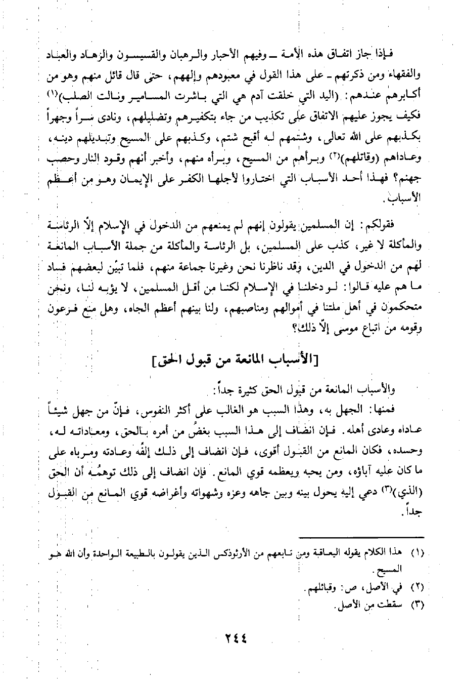 فَقَوْلُكُمْ: إِنَّ الْمُسْلِمِينَ يَقُولُونَ إِنَّهُمْ لَمْ يَمْنَعْهُمْ مِنَ الدُّخُولِ فِي الْإِسْلَامِ إِلَّا الرِّئَاسَةُ وَالْمَأْكَلَةُ لَا غَيْرَ، كَذِبٌ عَلَى الْمُسْلِمِينَ، بَلْ الرِّئَاسَةُ وَالْمَأْكَلَةُ مِنْ جُمْلَةِ الْأَسْبَابِ الْمَانِعَةِ لَهُمْ مِنَ الدُّخُولِ فِي الدِّينِ، وَقَدْ نَاظَرْنَا نَحْنُ وَغَيْرُنَا جَمَاعَةً مِنْهُمْ، فَلَمَّا تَبَيَّنَ لِبَعْضِهِمْ فَسَادُ مَا هُمْ عَلَيْهِ، قَالُوا: لَوْ دَخَلْنَا فِي الْإِسْلَامِ لَكُنَّا مِنْ أَقَلِّ الْمُسْلِمِينَ لَا يُؤْبَهُ لَنَا، وَنَحْنُ مُتَحَكِّمُونَ فِي أَهْلِ مِلَّتِنَا فِي أَمْوَالِهِمْ وَمَنَاصِبِهِمْ وَلَنَا بَيْنَهُمْ أَعْظَمُ الْجَاهِ!، وَهَلْ مَنَعَ فِرْعَوْنَ وَقَوْمَهُ مِنَ اتِّبَاعِ مُوسَى إِلَّا ذَلِكَ؟!