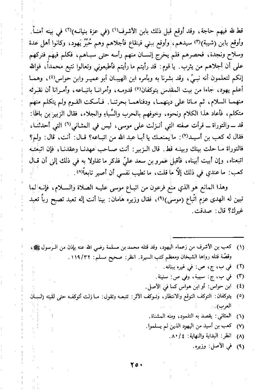 قَطُّ لِلَّهِ فِيهِمْ حَاجَةٌ، وَقَدْ أَوْقَعَ قَبْلَ ذَلِكَ بِابْنِ الْأَشْرَفِ فِي عِزَّةِ بُنْيَانِهِ فِي بَيْتِهِ آمِنًا، وَأَوْقَعَ بِابْنِ شَيْبَةَ سَيِّدِهِمْ، وَأَوْقَعَ بِبَنِي قَيْنُقَاعَ فَأَجْلَاهُمْ وَهُمْ حُبْرُ يَهُودَ وَكَانُوا أَهْلَ عُدَّةٍ وَسِلَاحٍ وَنَجْدَةٍ - فَحَصَرَهُمْ فَلَمْ يُخْرِجْ إِنْسَانٌ مِنْهُمْ رَأْسَهُ حَتَّى سَبَاهُمْ، فَكُلِّمَ فِيهِمْ فَتَرَكَهُمْ عَلَى أَنْ أَجْلَاهُمْ مِنْ يَثْرِبَ. يَا قَوْمِ، قَدْ رَأَيْتُمْ مَا رَأَيْتُمْ فَأَطِيعُونِي وَتَعَالَوْا نَتَّبِعْ مُحَمَّدًا، فَوَاللَّهِ إِنَّكُمْ لَتَعْلَمُونَ أَنَّهُ نَبِيٌّ وَقَدْ بَشَّرَنَا بِهِ وَبِأَمْرِهِ ابْنُ الْهَيْبَانِ أَبُو عُمَيْرٍ، وَابْنُ حَوَّاسٍ، وَهُمَا أَعْلَمُ يَهُودَ جَاءَا مِنْ بَيْتِ الْمَقْدِسِ يَتَوَكَّفَانِ قُدُومَهُ، وَأَمَرَانَا بِاتِّبَاعِهِ وَأَمَرَانَا أَنْ نُقْرِئَهُ مِنْهُمَا السَّلَامَ، ثُمَّ مَاتَا عَلَى دِينِهِمَا، وَدَفَنَّاهُمَا بِحَرَّتِنَا، فَأُسْكِتَ الْقَوْمُ فَلَمْ يَتَكَلَّمْ مِنْهُمْ مُتَكَلِّمٌ، فَأَعَادَ هَذَا الْكَلَامَ وَنَحْوَهُ، وَخَوَّفَهُمْ بِالْحَرْبِ وَالسِّبَاءِ وَالْجَلَاءِ، فَقَالَ الزُّبَيْرُ بْنُ بَاطَا: قَدْ – وَالتَّوْرَاةِ - قَرَأْتُ صِفَتَهُ فِي كِتَابِ التَّوْرَاةِ الَّتِي أُنْزِلَتْ عَلَى مُوسَى، لَيْسَ فِي الْمَثَانِي الَّتِي أَحْدَثْنَا، فَقَالَ لَهُ كَعْبُ بْنُ أُسَيْدٍ: مَا يَمْنَعُكَ يَا أَبَا عَبْدِ الرَّحْمَنِ مِنِ اتِّبَاعِهِ؟ قَالَ: أَنْتَ، قَالَ: وَلِمَ؟ فَوَالتَّوْرَاةِ مَا حُلْتُ بَيْنَكَ وَبَيْنَهُ قَطُّ؟ قَالَ الزُّبَيْرُ: أَنْتَ صَاحِبُ عَهْدِنَا وَعَقْدِنَا، فَإِنِ اتَّبَعْتَهُ اتَّبَعْنَاهُ، وَإِنْ أَبَيْتَ أَبَيْنَاهُ، فَأَقْبَلَ عَمْرُو بْنُ سَعْدٍ عَلَيَّ فَذَكَرَ مَا تَقَاوَلَا بِهِ فِي ذَلِكَ إِلَى أَنْ قَالَ كَعْبٌ: مَا عِنْدِي فِي ذَلِكَ إِلَّا مَا قُلْتُ، مَا تَطِيبُ نَفْسِي أَنْ أَصِيرَ تَابِعًا.