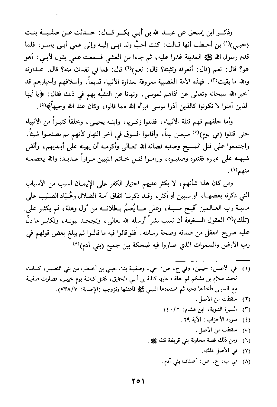 وَذَكَرَ ابْنُ إِسْحَاقَ عَنْ عَبْدِ اللَّهِ بْنِ أَبِي بَكْرٍ، قَالَ: حُدِّثْتُ ... عَنْ صَفِيَّةَ بِنْتِ حُيَيِّ بْنِ أَخْطَبَ، أَنَّهَا قَالَتْ: كُنْتُ أَحَبَّ وَلَدِ أَبِي إِلَيْهِ وَإِلَى عَمِّي أَبِي يَاسِرٍ، فَلَمَّا قَدِمَ رَسُولُ اللَّهِ صَلَّى اللَّهُ عَلَيْهِ وَسَلَّمَ الْمَدِينَةَ غَدَوْا عَلَيْهِ، ثُمَّ جَاءَا مِنَ الْعَشِيِّ، فَسَمِعْتُ عَمِّي يَقُولُ لِأَبِي: أَهُوَ هُوَ؟ قَالَ: نَعَمْ، قَالَ: أَتَعْرِفُهُ وَتُثْبِتُهُ؟، قَالَ نَعَمْ، قَالَ: فَمَا فِي نَفْسِكَ مِنْهُ، قَالَ: عَدَوَاتُهُ وَاللَّهِ مَا بَقِيتُ.... فَهَذِهِ الْأُمَّةُ الْغَضَبِيَّةُ مَعْرُوفَةٌ بِعَدَاوَةِ الْأَنْبِيَاءِ قَدِيمًا، وَأَسْلَافُهُمْ وَأَحْبَارُهُمْ قَدْ أَخْبَرَ اللَّهُ سُبْحَانَهُ وَتَعَالَى عَنْ أَذَاهُمْ لِمُوسَى، وَنَهَانَا عَنِ التَّشَبُّهِ بِهِمْ فِي ذَلِكَ، فَقَالَ: يَاأَيُّهَا الَّذِينَ آمَنُوا لَا تَكُونُوا كَالَّذِينَ آذَوْا مُوسَى فَبَرَّأَهُ اللَّهُ مِمَّا قَالُوا وَكَانَ عِنْدَ اللَّهِ وَجِيهًا.