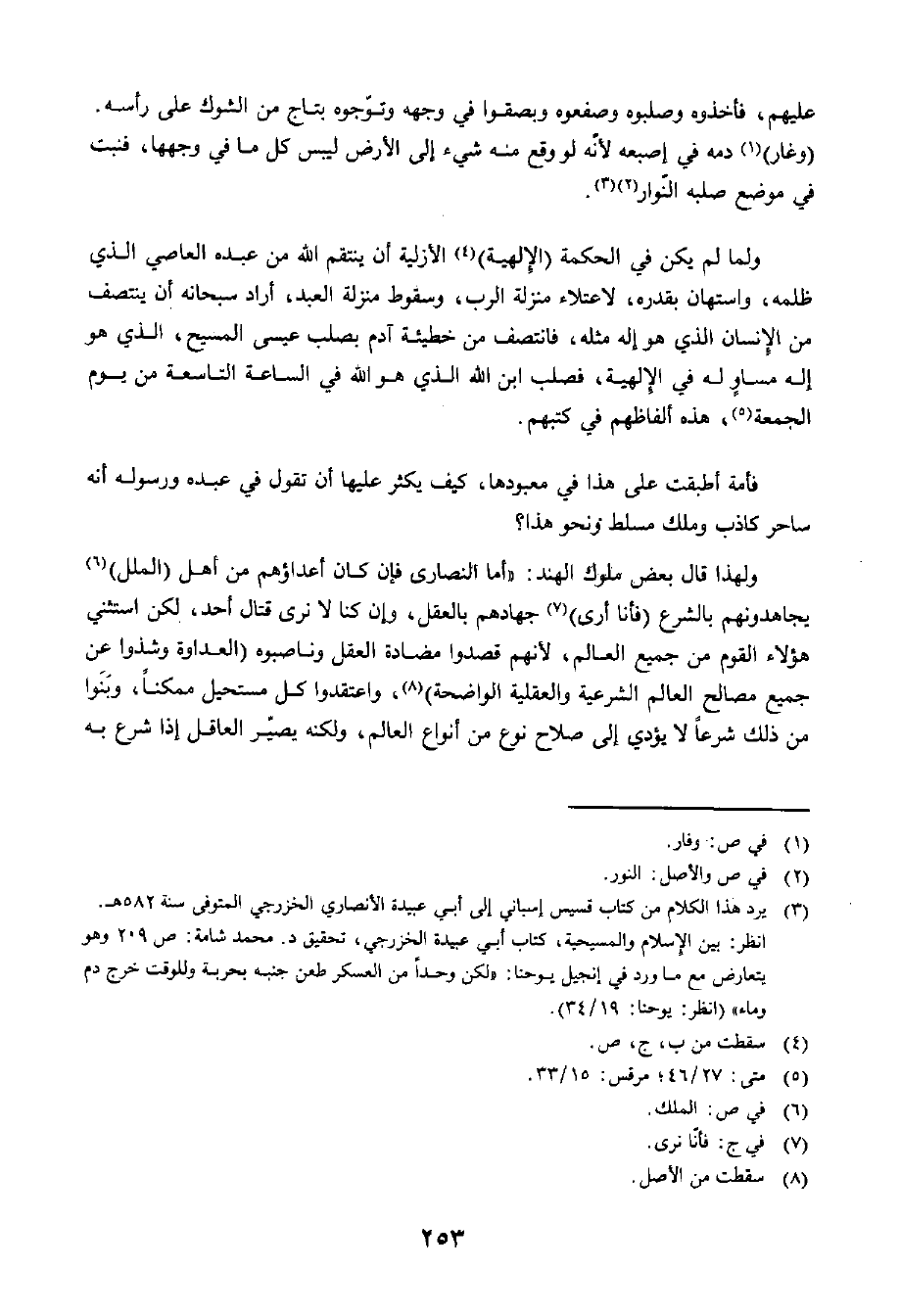 وَلَمَّا لَمْ يَكُنْ فِي الْحِكْمَةِ الْإِلَهِيَّةِ أَنْ يَنْتَقِمَ اللَّهُ مِنْ عَبْدِهِ الْعَاصِي الَّذِي ظَلَمَهُ، وَاسْتَهَانَ بِقَدْرِهِ، لِاعْتِلَاءِ مَنْزِلَةِ الرَّبِّ، وَسُقُوطِ مَنْزِلَةِ الْعَبْدِ، أَرَادَ سُبْحَانَهُ أَنْ يَنْتَصِفَ مِنَ الْإِنْسَانِ الَّذِي هُوَ إِلَهٌ مِثْلُهُ، فَانْتَصَفَ مِنْ خَطِيئَةِ آدَمَ بِصَلْبِ عِيسَى الْمَسِيحِ، الَّذِي هُوَ إِلَهٌ مُسَاوٍ لَهُ فِي الْإِلَهِيَّةِ، فَصُلِبَ ابْنُ اللَّهِ الَّذِي هُوَ اللَّهُ فِي السَّاعَةِ التَّاسِعَةِ مِنْ يَوْمِ الْجُمُعَةِ. هَذِهِ أَلْفَاظُهُمْ فِي كُتُبِهِمْ.