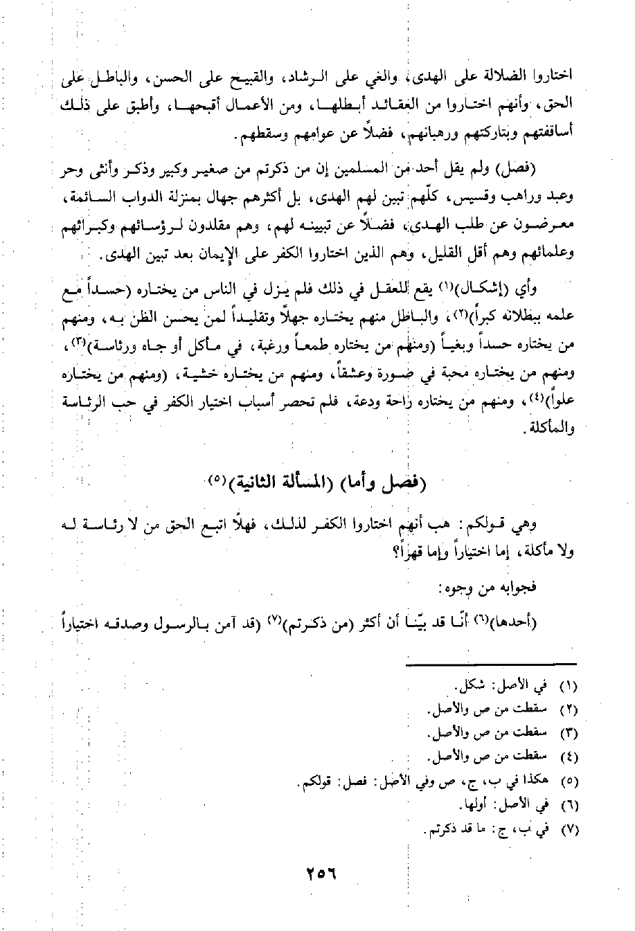 وَأَيُّ إِشْكَالٍ يَقَعُ لِلْعَقْلِ فِي ذَلِكَ؟ فَلَمْ يَزَلْ فِي النَّاسِ مَنْ يَخْتَارُهُ حَسَدًا مَعَ عِلْمِهِ بِبُطْلَانِهِ كِبْرًا، وَالْبَاطِلُ مِنْهُمْ يَخْتَارُهُ جَهْلًا وَتَقْلِيدًا لِمَنْ يُحْسِنُ الظَّنَّ بِهِ، وَمِنْهُمْ مَنْ يَخْتَارُهُ حَسَدًا وَبَغْيًا، وَمِنْهُمْ مَنْ يَخْتَارُهُ طَمَعًا وَرَغْبَةً فِي مَأْكَلٍ أَوْ جَاهٍ وَرِئَاسَةٍ، وَمِنْهُمْ مَنْ يَخْتَارُهُ مَحَبَّةً فِي صُورَةٍ وَعِشْقًا، وَمِنْهُمْ مَنْ يَخْتَارُهُ خَشْيَةً، وَمِنْهُمْ مَنْ يَخْتَارُهُ عُلُوًّا، وَمِنْهُمْ مَنْ يَخْتَارُهُ رَاحَةً وَدَعَةً، فَلَمْ تُحْصَرْ أَسْبَابُ اخْتِيَارِ الْكُفْرِ فِي حُبِّ الرِّئَاسَةِ وَالْمَأْكَلَةِ.