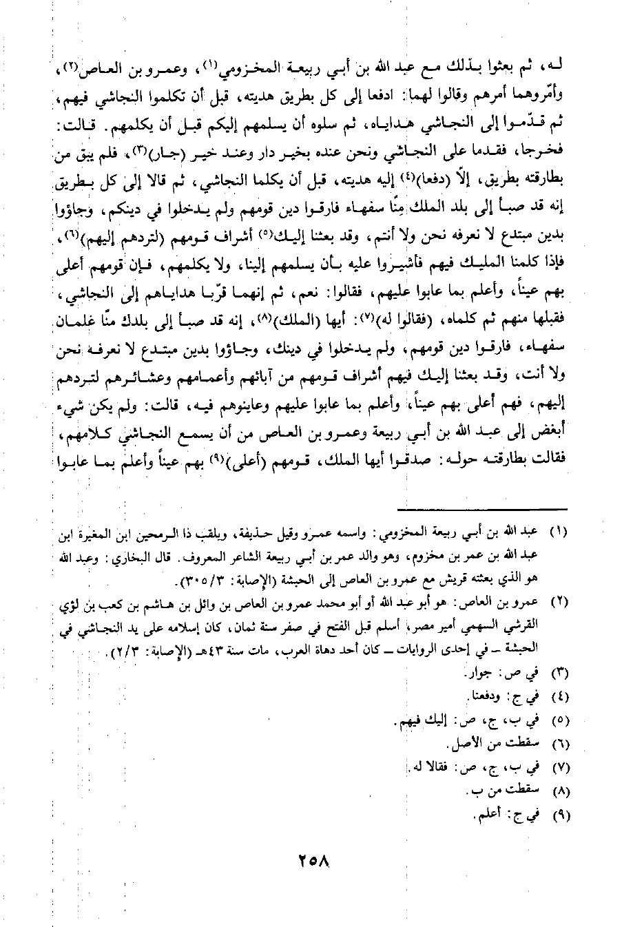 لَهُ، ثُمَّ بَعَثُوا بِذَلِكَ مَعَ عَبْدِ اللَّهِ بْنِ أَبِي رَبِيعَةَ الْمَخْزُومِيِّ، وَعَمْرِو بْنِ الْعَاصِ، وَأَمَرُوهُمَا أَمْرَهُمْ، وَقَالُوا لَهُمَا: ادْفَعَا إِلَى كُلِّ بِطْرِيقٍ هَدِيَّتَهُ قَبْلَ أَنْ تُكَلِّمُوا النَّجَاشِيَّ فِيهِمْ، ثُمَّ قَدِّمَا إِلَى النَّجَاشِيِّ هَدَايَاهُ، ثُمَّ سَلُوهُ أَنْ يُسَلِّمَهُمْ إِلَيْكُمْ قَبْلَ أَنْ يُكَلِّمَهُمْ. قَالَتْ: فَخَرَجَا، فَقَدِمَا عَلَى النَّجَاشِيِّ، وَنَحْنُ عِنْدَهُ بِخَيْرِ دَارٍ، وَعِنْدَ خَيْرِ جَارٍ، فَلَمْ يَبْقَ مِنْ بَطَارِقَتِهِ بِطَرِيقٌ إِلَّا دَفَعَا إِلَيْهِ هَدِيَّتَهُ، قَبْلَ أَنْ يُكَلِّمَا النَّجَاشِيَّ، ثُمَّ قَالَا إِلَى كُلِّ بِطْرِيقٍ: إِنَّهُ قَدْ صَبَأَ إِلَى بَلَدِ الْمَلِكِ مِنَّا سُفَهَاءُ، فَارَقُوا دِينَ قَوْمِهِمْ، وَلَمْ يَدْخُلُوا فِي دِينِكُمْ، وَجَاءُوا بَدِينٍ مُبْتَدَعٍ لَا نَعْرِفُهُ نَحْنُ وَلَا أَنْتُمْ، وَقَدْ بَعَثَنَا إِلَيْكَ فِيهِمْ أَشْرَافُ قَوْمِهِمْ لِتَرُدَّهُمْ إِلَيْهِمْ، فَإِذَا كَلَّمْنَا الْمَلِيكَ فِيهِمْ فَأَشِيرُوا عَلَيْهِ بِأَنْ يُسَلِّمَهُمْ إِلَيْنَا، وَلَا يُكَلِّمَهُمْ، فَإِنَّ قَوْمَهُمْ أَعْلَى بِهِمْ عَيْنًا، وَأَعْلَمُ بِمَا عَابُوا عَلَيْهِمْ، فَقَالُوا: نَعَمْ. ثُمَّ إِنَّهُمَا قَرَّبَا هَدَايَاهُمْ إِلَى النَّجَاشِيِّ فَقَبِلَهَا مِنْهُمَا، ثُمَّ كَلَّمَاهُ فَقَالُوا لَهُ: أَيُّهَا الْمَلِكُ، إِنَّهُ قَدْ صَبَأَ إِلَى بَلَدِكَ مِنَّا غِلْمَانٌ سُفَهَاءُ فَارَقُوا دِينَ قَوْمِهِمْ وَلَمْ يَدْخُلُوا فِي دِينِكَ، وَجَاءُوا بَدِينٍ مُبْتَدَعٍ لَا نَعْرِفُهُ نَحْنُ وَلَا أَنْتَ، وَقَدْ بَعَثَنَا إِلَيْكَ فِيهِمْ أَشْرَافُ قَوْمِهِمْ مِنْ آبَائِهِمْ وَأَعْمَامِهِمْ وَعَشَائِرِهِمْ لِتَرُدَّهُمْ إِلَيْهِمْ، فَهُمْ أَعْلَى بِهِمْ عَيْنًا، وَأَعْلَمُ بِمَا عَابُوا عَلَيْهِمْ وَعَايَنُوهُمْ فِيهِ، قَالَتْ: وَلَمْ يَكُنْ شَيْءٌ أَبْغَضَ إِلَى عَبْدِ اللَّهِ بْنِ أَبِي رَبِيعَةَ وَعَمْرِو بْنِ الْعَاصِ مِنْ أَنْ يَسْمَعَ النَّجَاشِيُّ كَلَامَهُمْ، فَقَالَتْ بَطَارِقَتُهُ حَوْلَهُ: صَدَقُوا أَيُّهَا الْمَلِكُ، قَوْمُهُمْ أَعْلَى بِهِمْ عَيْنًا وَأَعْلَمُ بِمَا عَابُوا