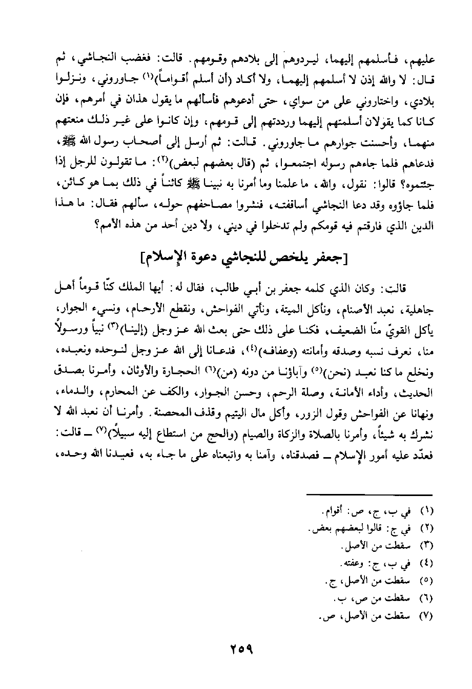 قَالَتْ: وَكَانَ الَّذِي كَلَّمَهُ جَعْفَرُ بْنُ أَبِي طَالِبٍ، فَقَالَ لَهُ: أَيُّهَا الْمَلِكُ! كُنَّا قَوْمًا أَهْلَ جَاهِلِيَّةٍ نَعْبُدُ الْأَصْنَامَ، وَنَأْكُلُ الْمَيْتَةَ، وَنَأْتِي الْفَوَاحِشَ، وَنَقْطَعُ الْأَرْحَامَ، وَنُسِيءُ الْجِوَارَ، يَأْكُلُ الْقَوِيُّ مِنَّا الضَّعِيفَ، فَكُنَّا عَلَى ذَلِكَ حَتَّى بَعَثَ اللَّهُ عَزَّ وَجَلَّ إِلَيْنَا نَبِيًّا وَرَسُولًا مِنَّا، نَعْرِفُ نَسَبَهُ وَصِدْقَهُ وَأَمَانَتَهُ وَعَفَافَهُ، فَدَعَانَا إِلَى اللَّهِ عَزَّ وَجَلَّ لِنُوَحِّدَهُ وَنَعْبُدَهُ، وَنَخْلَعَ مَا كُنَّا نَعْبُدُ نَحْنُ وَآبَاؤُنَا مِنْ دُونِهِ مِنَ الْحِجَارَةِ وَالْأَوْثَانِ، وَأَمَرَنَا بِصِدْقِ الْحَدِيثِ، وَأَدَاءِ الْأَمَانَةِ، وَصِلَةِ الرَّحِمِ، وَحُسْنِ الْجِوَارِ، وَالْكَفِّ عَنِ الْمَحَارِمِ، وَالدِّمَاءِ، وَنَهَانَا عَنِ الْفَوَاحِشِ، وَقَوْلِ الزُّورِ، وَأَكْلِ مَالِ الْيَتِيمِ وَقَذْفِ الْمُحْصَنَةِ، وَأَمَرَنَا أَنْ نَعْبُدَ اللَّهَ لَا نُشْرِكَ بِهِ شَيْئًا، وَأَمَرَنَا بِالصَّلَاةِ وَالزَّكَاةِ وَالصِّيَامِ وَالْحَجِّ مَنِ اسْتَطَاعَ إِلَيْهِ سَبِيلًا قَالَتْ: فَعَدَّدَ عَلَيْهِ أُمُورَ الْإِسْلَامِ، فَصَدَّقْنَاهُ، وَآمَنَّا بِهِ وَاتَّبَعْنَاهُ عَلَى مَا جَاءَ بِهِ، فَعَبَدْنَا اللَّهَ وَحْدَهُ،