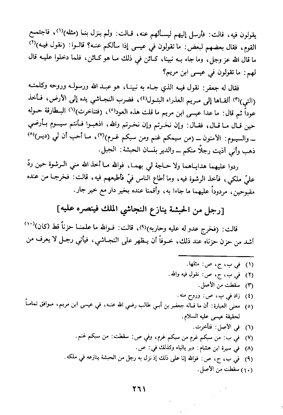 فَقَالَ لَهُ جَعْفَرٌ: نَقُولُ فِيهِ الَّذِي جَاءَ بِهِ نَبِيُّنَا، هُوَ عَبْدُ اللَّهِ وَرَسُولُهُ وَرُوحُهُ وَكَلِمَتُهُ الَّتِي أَلْقَاهَا إِلَى مَرْيَمَ الْعَذْرَاءِ الْبَتُولِ، فَضَرَبَ النَّجَاشِيُّ يَدَهُ إِلَى الْأَرْضِ، فَأَخَذَ عُودًا، ثُمَّ قَالَ: مَا عَدَا عِيسَى ابْنُ مَرْيَمَ، مَا قُلْتَ هَذِهِ الْعُودَ، فَتَنَاخَرَتِ الْبَطَارِقَةُ حَوْلَهُ حِينَ قَالَ مَا قَالَ، فَقَالَ: وَإِنْ نَخَرْتُمْ، وَإِنْ نَخَرْتُمْ وَاللَّهِ، اذْهَبُوا فَأَنْتُمْ سُيُومٌ بِأَرْضِي - وَالسُّيُومُ: الْآمِنُونَ - مَنْ سَيَمَكُمْ غَنِمَ وَمَنْ سَبَّكُمْ غَرِمَ، مَا أُحِبُّ أَنَّ لِي دَيْرًا ذَهَبًا وَأَنِّي آذَيْتُ رَجُلًا مِنْكُمْ - وَالدَّيْرُ: بِلِسَانِ الْحَبَشَةِ الْجَبَلُ.