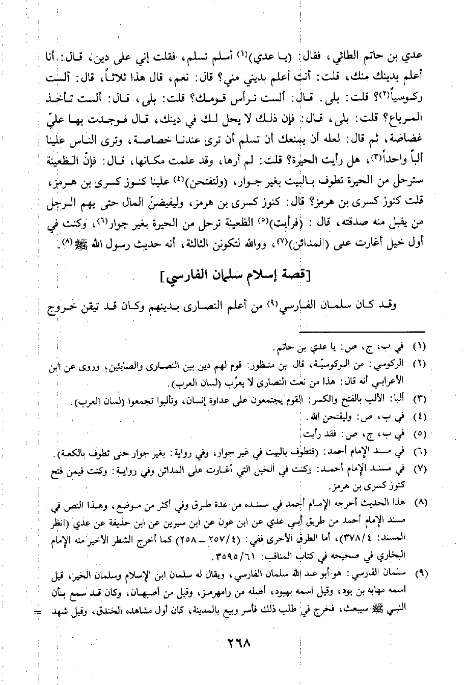 عَدِيُّ بْنُ حَاتِمٍ الطَّائِيُّ! فَقَالَ: يَا عَدِيُّ أَسْلِمْ تَسْلَمْ، فَقُلْتُ: إِنِّي عَلَى دِينٍ، قَالَ: أَنَا أَعْلَمُ بِدِينِكِ مِنْكَ، قُلْتُ: أَنْتَ أَعْلَمُ بِدِينِي مِنِّي؟ قَالَ: نَعَمْ، قَالَ هَذَا ثَلَاثًا، قَالَ: أَلَسْتَ رَكُوسِيًّا؟ قُلْتُ: بَلَى، قَالَ: أَلَسْتَ تَرْأَسُ قَوْمَكَ؟، قُلْتُ: بَلَى، قَالَ: أَلَسْتَ تَأْخُذُ الْمِرْبَاعَ، قُلْتُ بَلَى، قَالَ: فَإِنَّ ذَلِكَ لَا يَحِلُّ لَكَ فِي دِينِكَ، قَالَ: فَوَجَدْتُ بِهَا عَلَيَّ غَضَاضَةً، ثُمَّ قَالَ: لَعَلَّهُ أَنْ يَمْنَعَكَ أَنْ تُسْلِمَ أَنْ تَرَى عِنْدَنَا خَصَاصَةً، وَتَرَى النَّاسَ عَلَيْنَا أَلْبًا وَاحِدًا، هَلْ رَأَيْتَ الْحِيرَةَ؟ قُلْتُ: لَمْ أَرَهَا وَقَدْ عَلِمْتُ مَكَانَهَا، قَالَ: فَإِنَّ الظَّعِينَةَ سَتَرْحَلُ مِنَ الْحِيرَةِ تَطُوفُ بِالْبَيْتِ بِغَيْرِ جِوَارٍ، وَلَتُفْتَحَنَّ عَلَيْنَا كُنُوزُ كِسْرَى بْنِ هُرْمُزَ، قُلْتُ: كِسْرَى بْنُ هُرْمُزَ؟ قَالَ: كُنُوزُ كِسْرَى بْنِ هُرْمُزَ، وَلَيَفِيضُ الْمَالُ حَتَّى يُهِمَّ الرَّجُلُ مَنْ يَقْبَلُ مِنْهُ صَدَقَتَهُ، قَالَ: فَرَأَيْتُ الظَّعِينَةَ تَرْحَلُ مِنَ الْحِيرَةِ بِغَيْرِ جِوَارٍ، وَكُنْتُ فِي أَوَّلِ خَيْلٍ أَغَارَتْ عَلَى الْمَدَائِنِ، وَوَاللَّهِ لَتَكُونَنَّ الثَّالِثَةَ. إِنَّهُ حَدِيثُ رَسُولِ اللَّهِ صَلَّى اللَّهُ عَلَيْهِ وَسَلَّمَ.